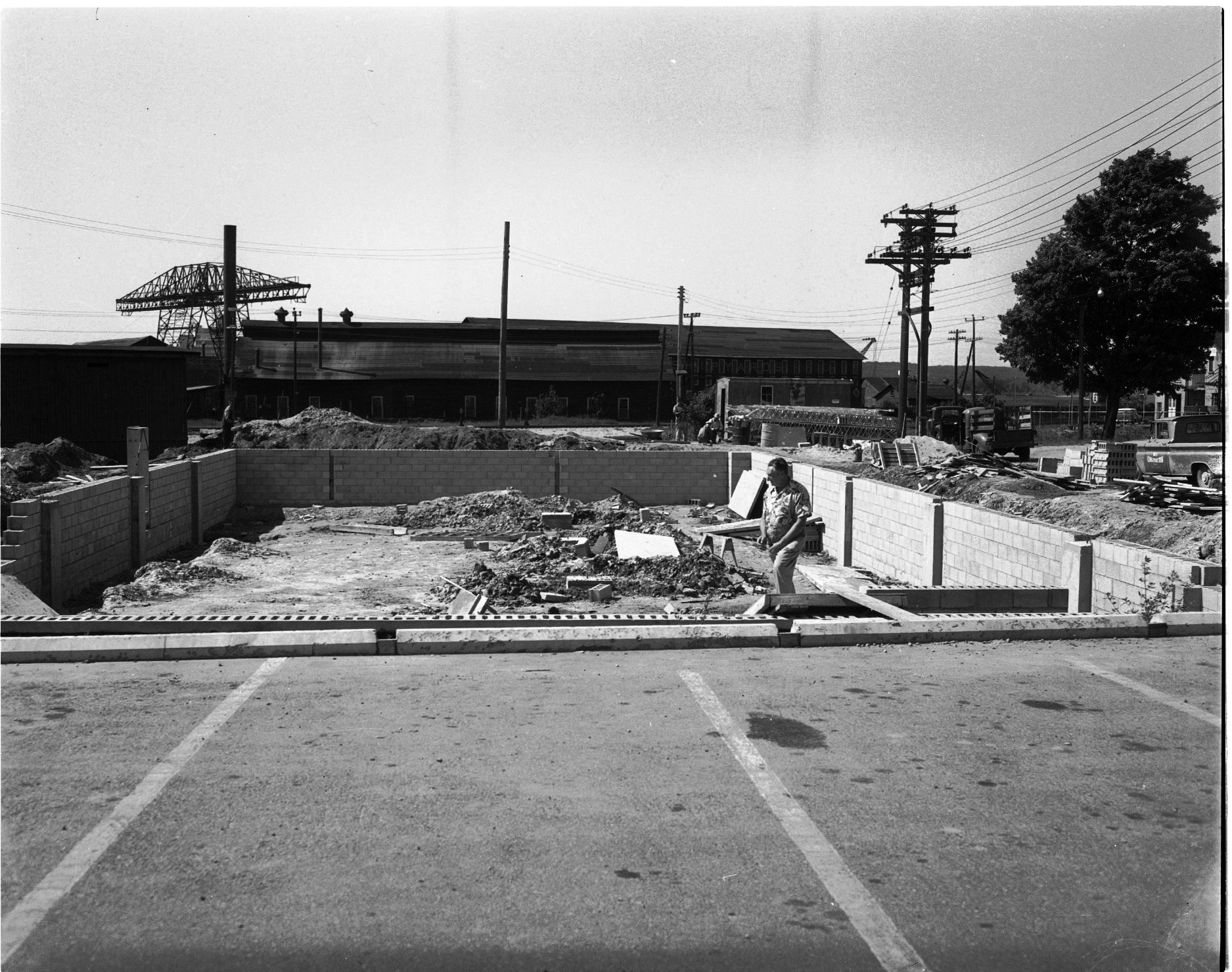 Good progress is being made on the new hall for Branch 80, Royal Canadian Legion, on Queen Street, Midland. Alf Rei, general contractor, is seen in the foreground examining some of the work on the $77,000 building.
