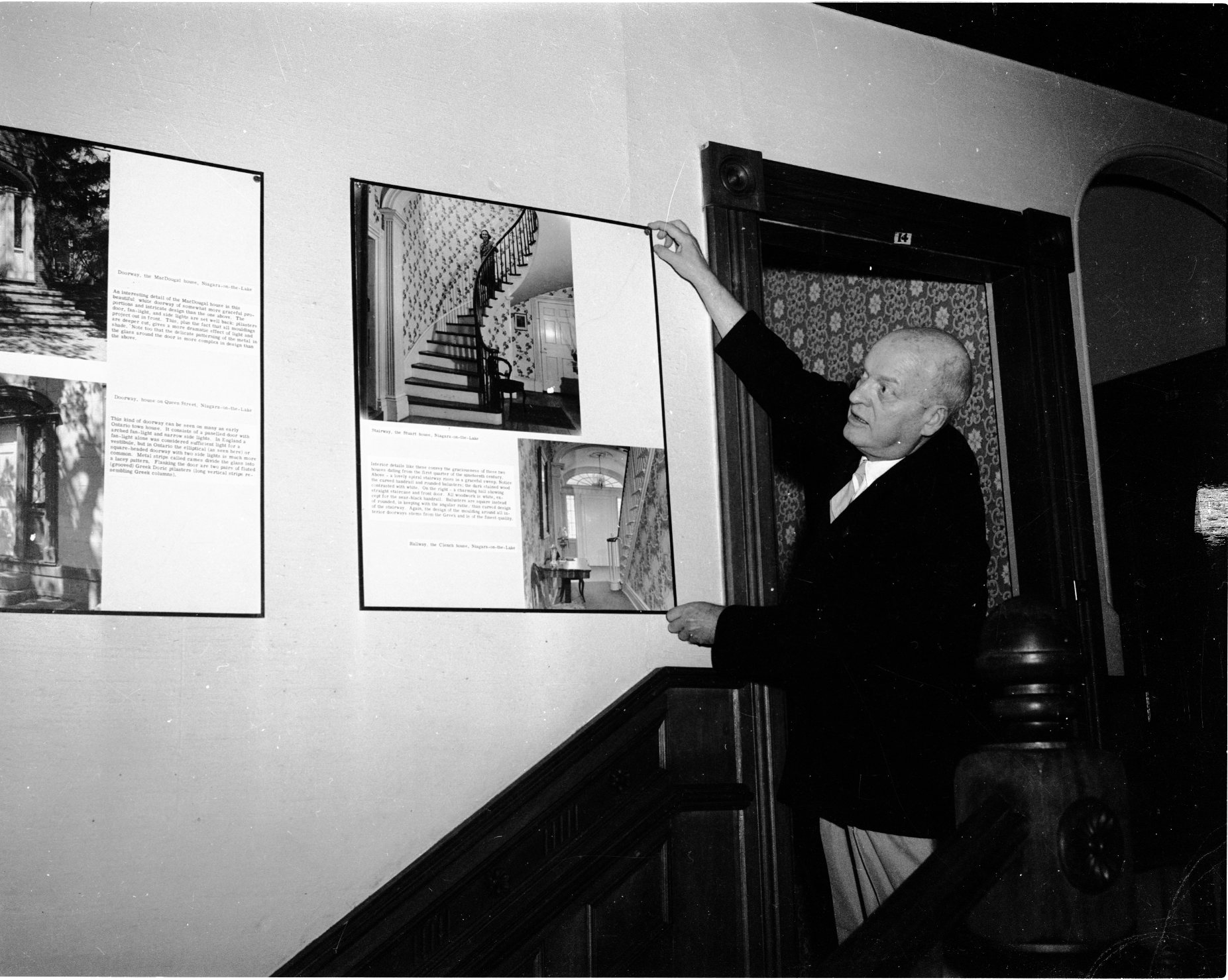 One of the new attractions this year is a picture display on the second floor (Still in the Playfair house). It depicts some of the outstanding Canadian architecture still standing in various Ontario communities today. Examples are old mills, blacksmith shops, schools, churches, doorways, elegant staircases, stores and fire places. Huronia Museum assistant James Robinson (former school principal) explains features of the museum’s architectural display.
