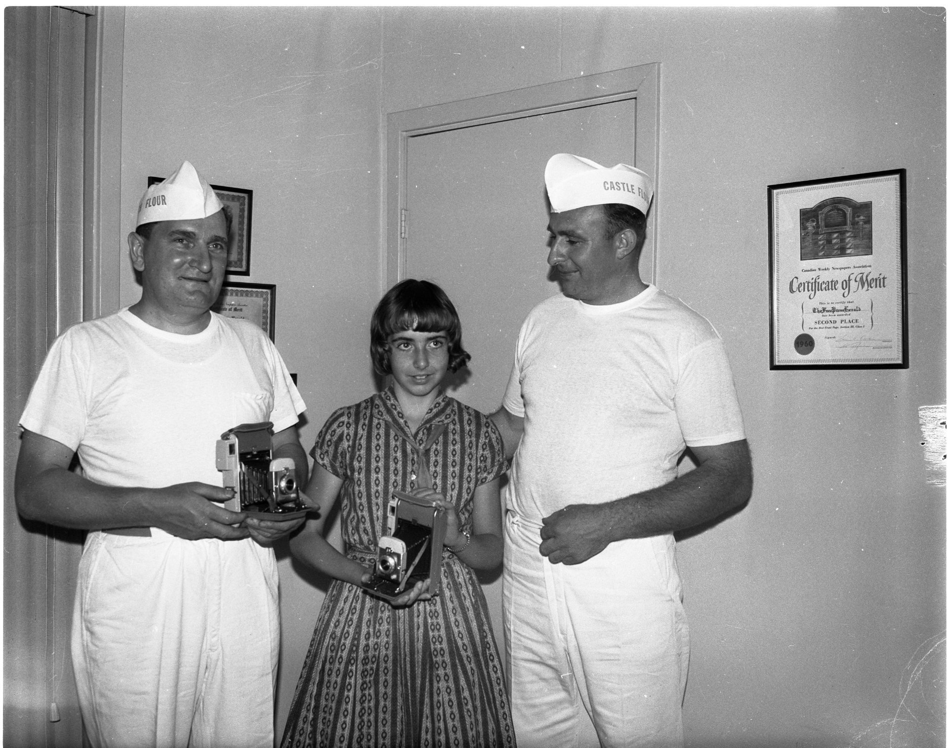 Winners of the final Polaroid camera contest, sponsored by this newspaper and district merchants were determined Thursday. Flanked by Gerry Gieseke, left, and Arnulf Beutler, right, co-winners of one of the cameras, is Carol Anne Wagg, 127 Scott Street, Midland, the other winner. Carol obtained her entry form at Holder’s Bakery.
