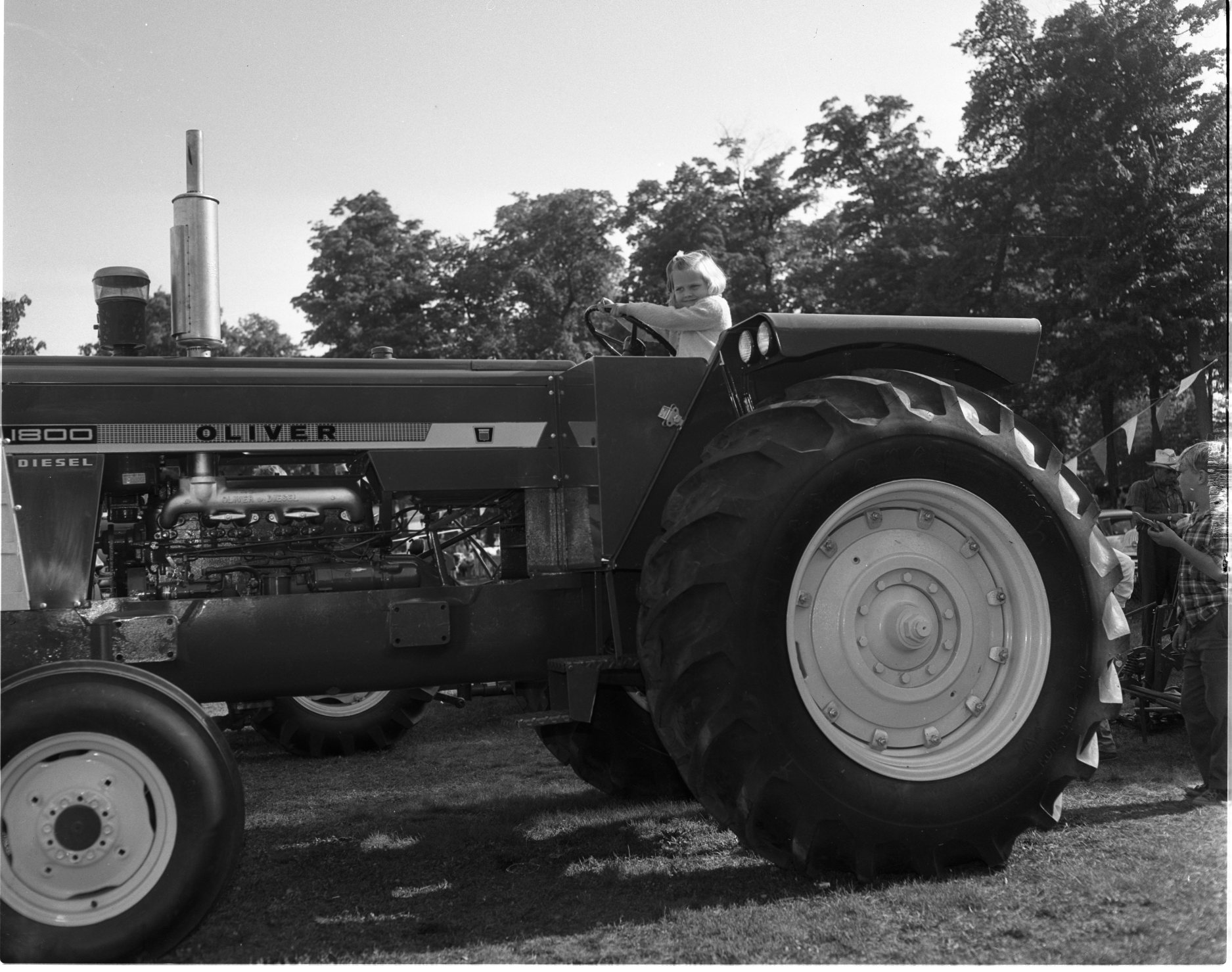 This huge tractor, on exhibit at Tiny and Tay fair, provided a fine perch for Debbie Knapp. She could see everything going on in the adjoining show ring. Debbie is the five-year-old daughter of Mr. and Mrs. Ed Knapp, Sunnyside.