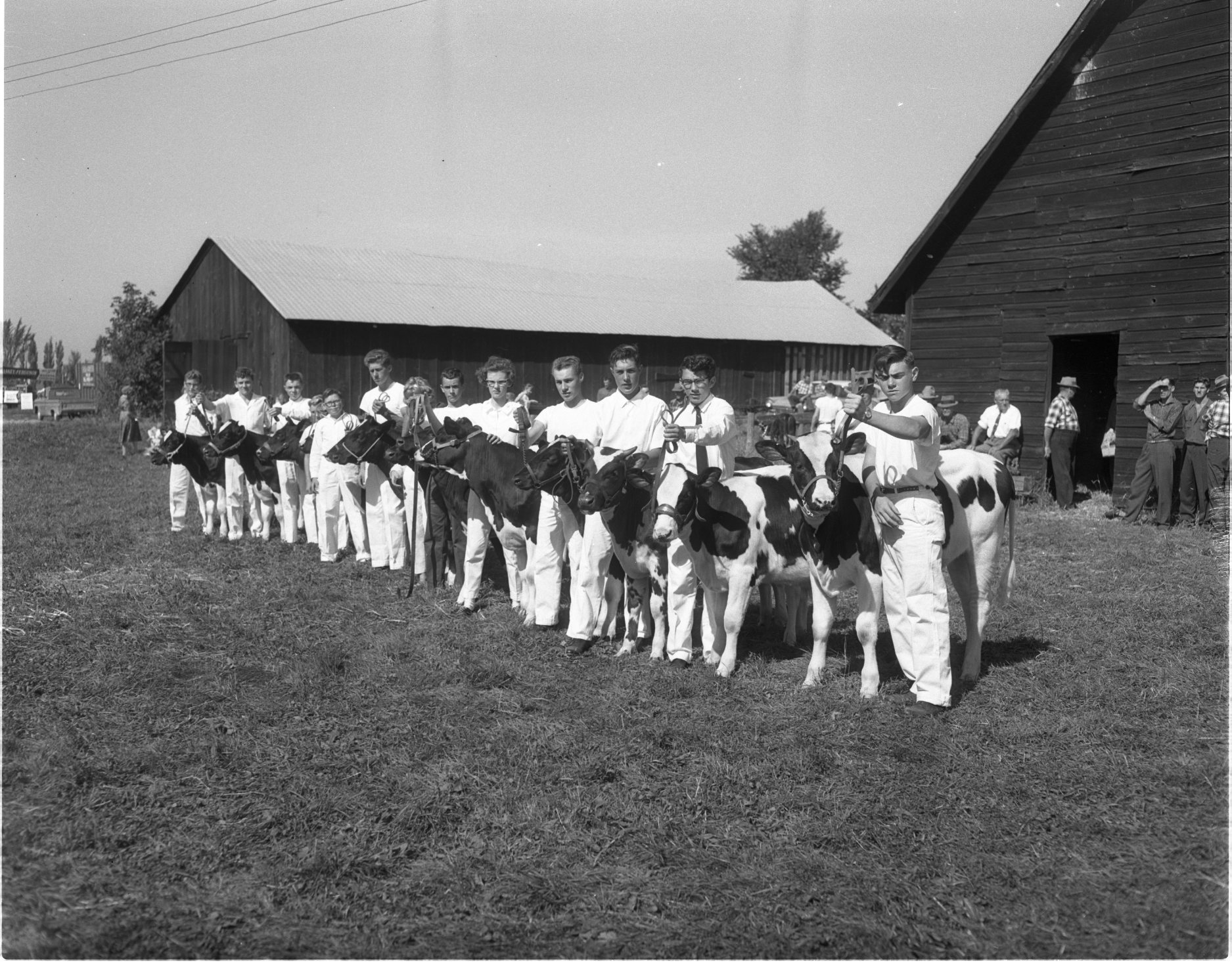 They’re still “keeping them down on the farm” around Elmvale, judging by this fine-looking group of young people taking part in the 4-H Calf Club achievement day at Elmvale fair last week. “And that’s only half the club members”, pointed out Keith Clay, North Simcoe assistant agrep. Nearest the camera, at right is Doug Lambie, R.R. 1, Wyevale, champion dairy showman, and next to him is Don Beardsall, R.R. 3, Elmvale, the reserve champion. Calf clubs in North Simcoe boast an increase in membership this year and “the parents are also taking a great deal more interest,” said Mr. Clay.