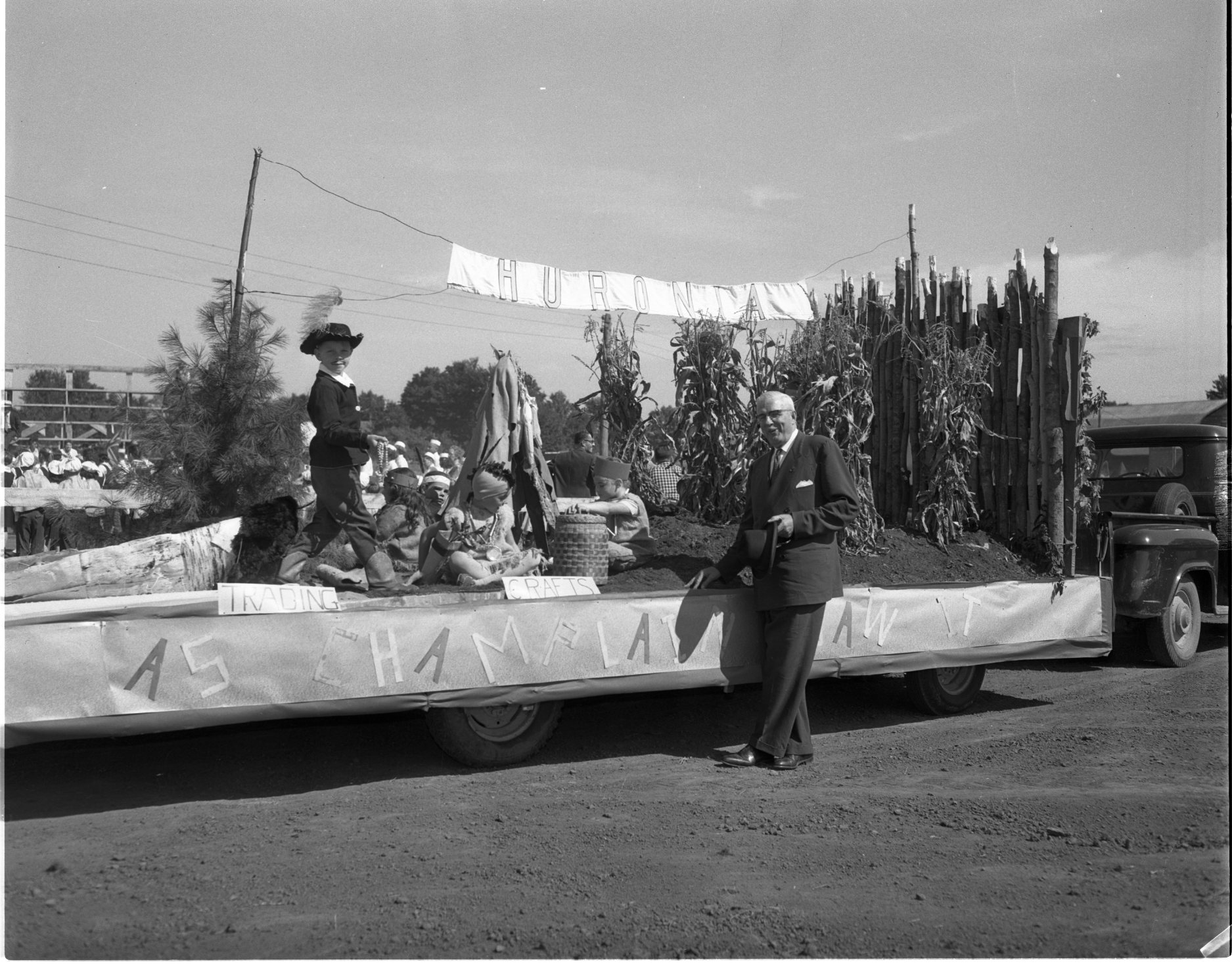 P. B. Rynard, M.P. for Simcoe East, is shown chatting to children on the Wyevale School float, entered in Elmvale fall fair parade last week. The float depicted Huronia “As Champlain saw it.” That’s “Samuel de” standing at left on the float.