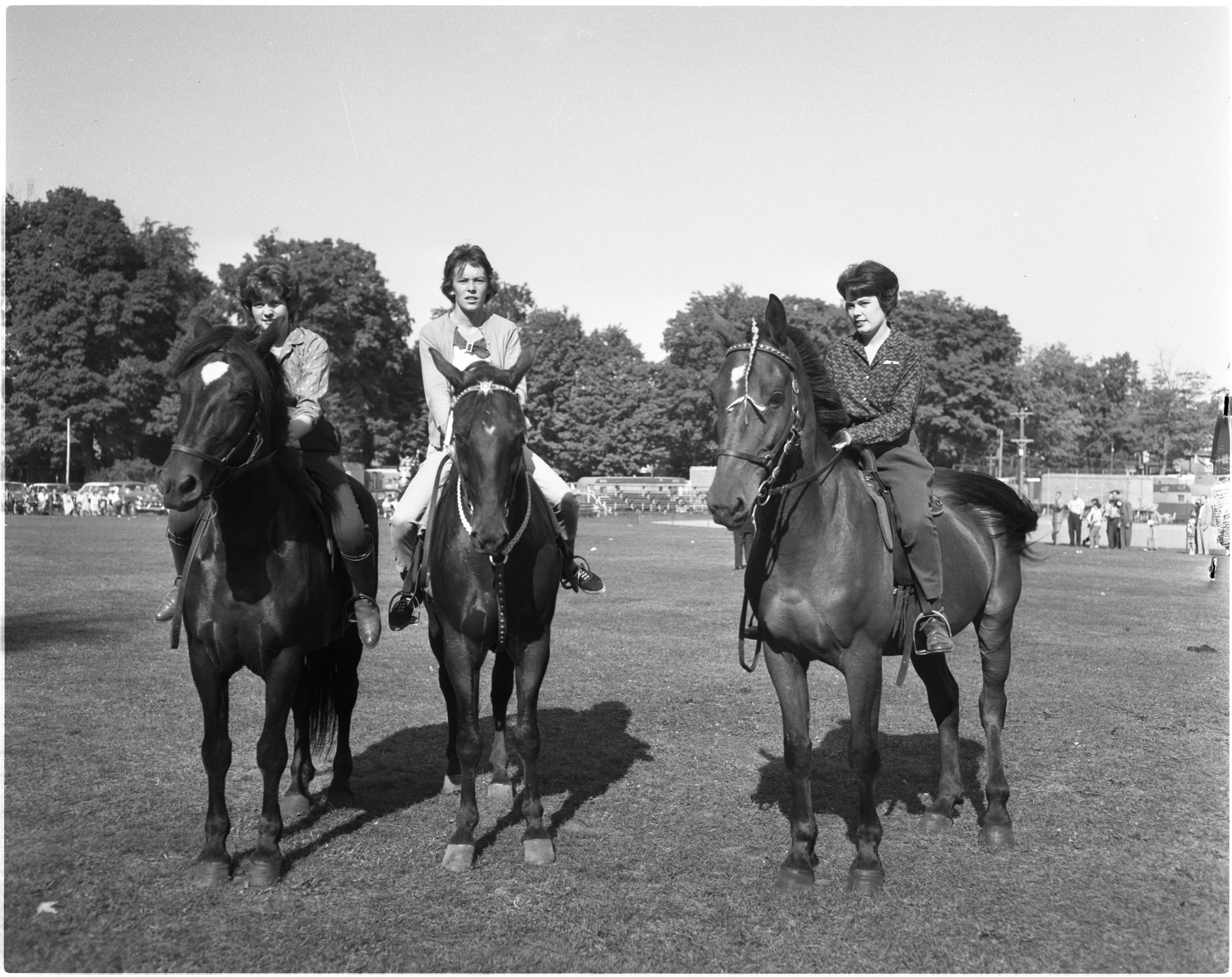 Horses are always one of the big attractions at fall fairs. This group was exhibited at Midland. Sonja Beatty (center) won top honours in the lady riders’ event over Mrs. Ralph Adamson (left) and Mrs. Al MacMillan, who are sisters.