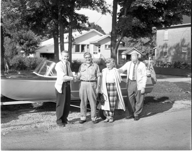 Winner of the Midland Rotary Club’s motor boat draw this year was Jack Foster, Toronto. Mr. and Mrs. Foster, seen with Rotarians Jim Henry (left) and Clint Truax (right) will keep the boat in Midland, where they have a cottage on the south shore of Little Lake. (This photo is the west side of Russell between Ellen and Colborne, Clint lived across the road and a few houses to the north. Officer/Coucillor Jack Charlebois’ white house and Harold McAllens brick house.)