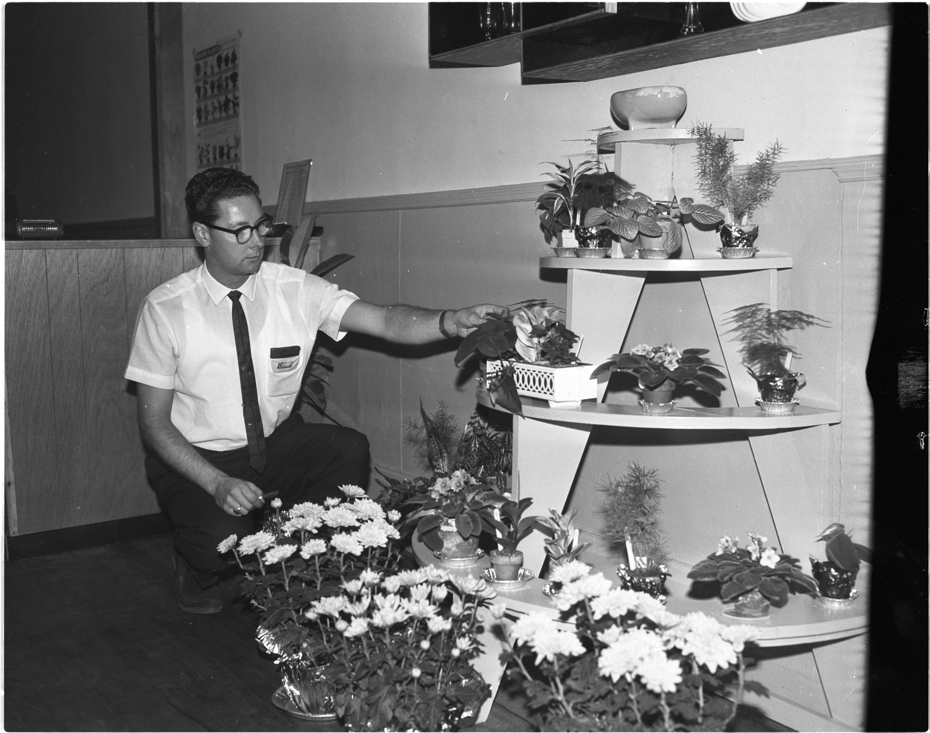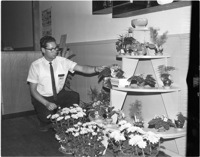 A native of Midland who has been away for several years, Ted Gerow returned to town recently to open up a new florist shop in the King Street store formerly occupied by the CN Express. Mr. Gerow is seen above arranging one of the stands in his new shop.