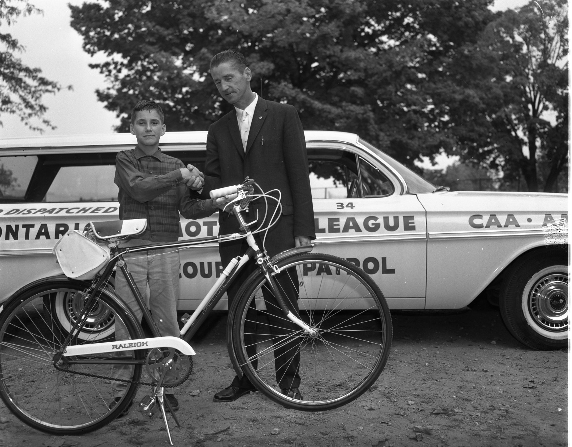 Proud winner of a new bicycle for his essay on “What safety means to me”, is Douglas Atkinson, of Bayview Public School, Midland. Son of Mr. and Mrs. Lloyd Atkinson, Doug is seen above with Norman Crane, Simcoe County representative for the Ontario Motor League, which sponsored the contest. Over 1,000 North Simcoe public school students submitted essays.