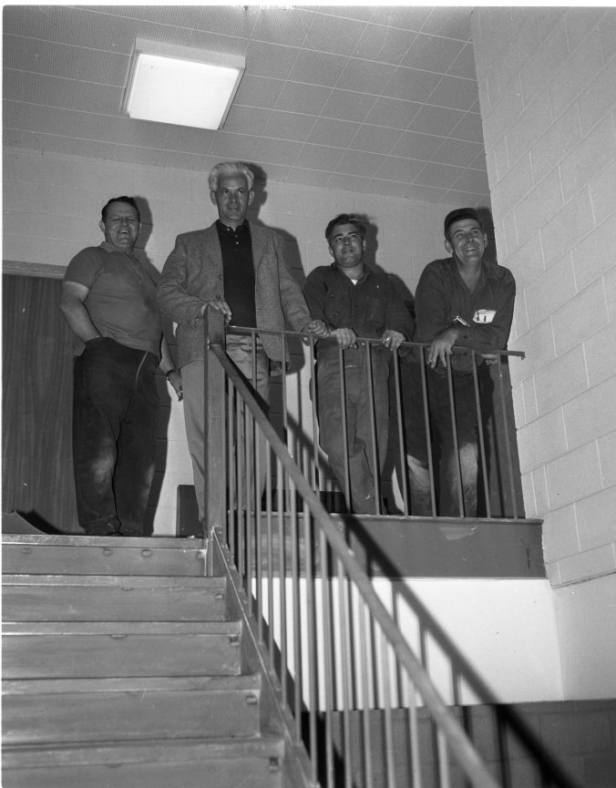 These members of Branch 80, Royal Canadian Legion, Midland, are smiling happily these days as their new hall on Queen Street rapidly nears completion. Seen on the big steel stair case are, left to right, George McLaughlin, president, Ken Williams, treasurer, Jim Duncan, secretary, and Oliver Lesperance, director.