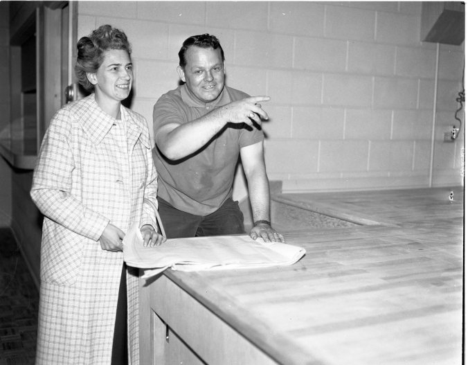 Looking over the plans for Midland’s new Legion Hall, and obviously pleased with progress to date, are Mrs. Clare Holden, president of the Ladies Auxiliary, and George McLaughlin, president of Branch 80, Royal Canadian Legion. New hall was used for first time Monday night at a meeting sponsored by Huronia Retarded Children’s Association.