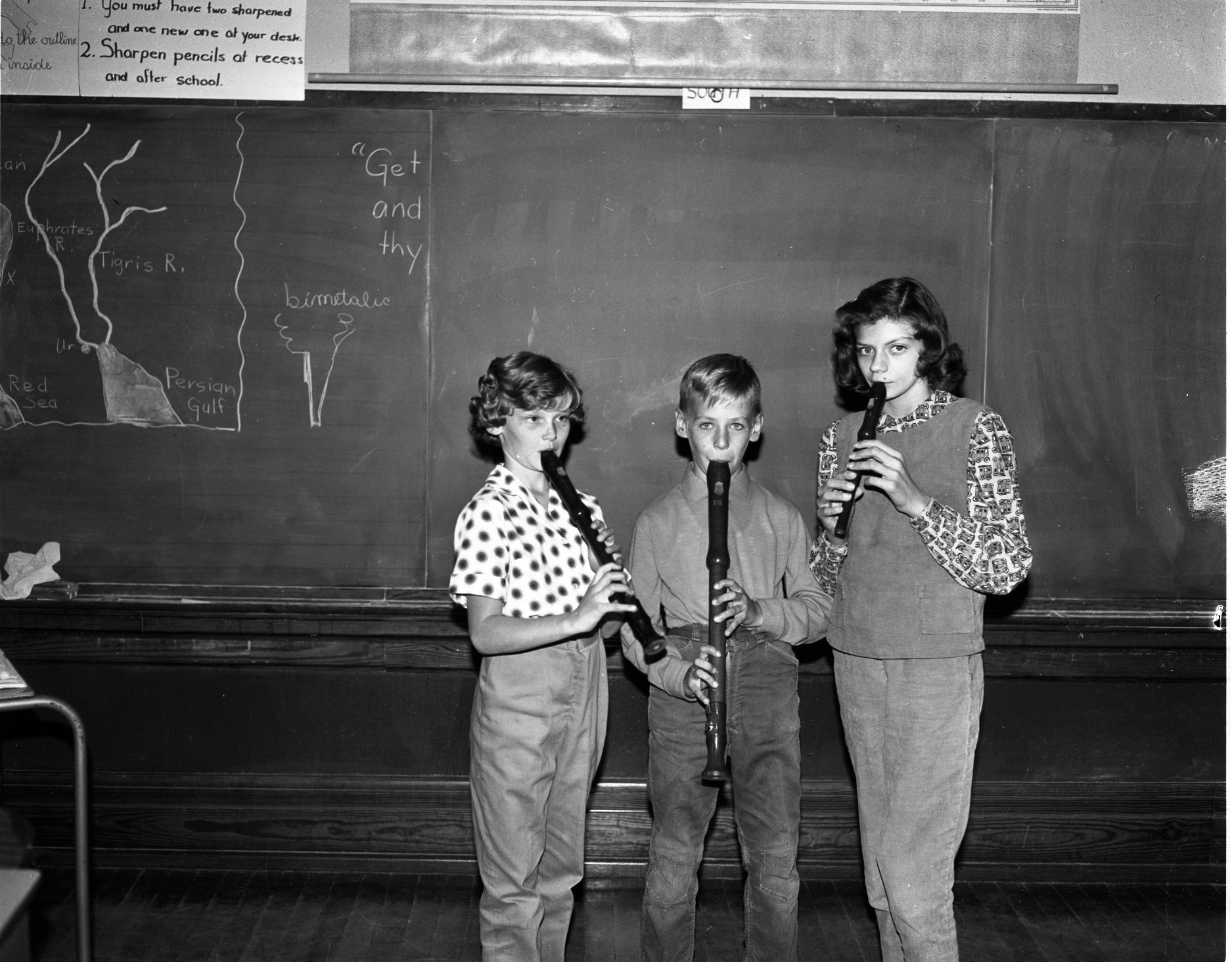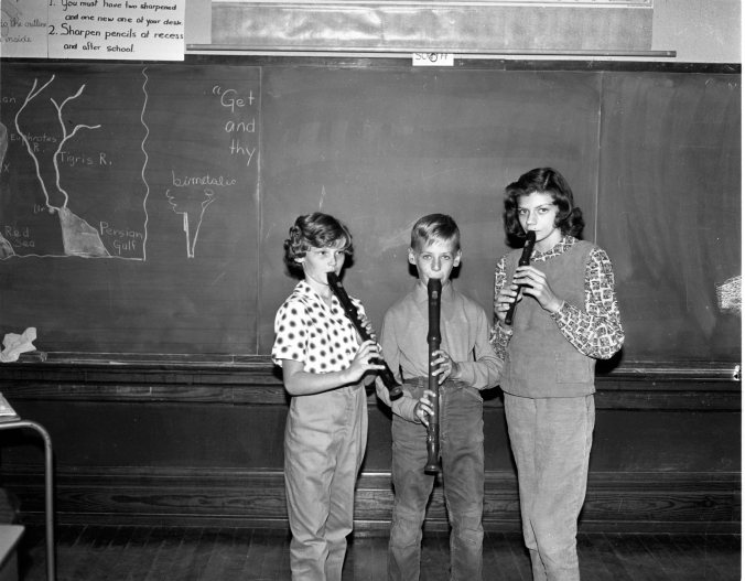 Deemed a success in its first year of operation last year, the Recorder Classes are to be continued again this year at all Midland public schools, under the guidance of Hessel Pape. Seen here are, left to right, Susan Hassell, alto recorder, Joey Fretina (s/b Tretina), tenor, and Barbara Jones, soprano.