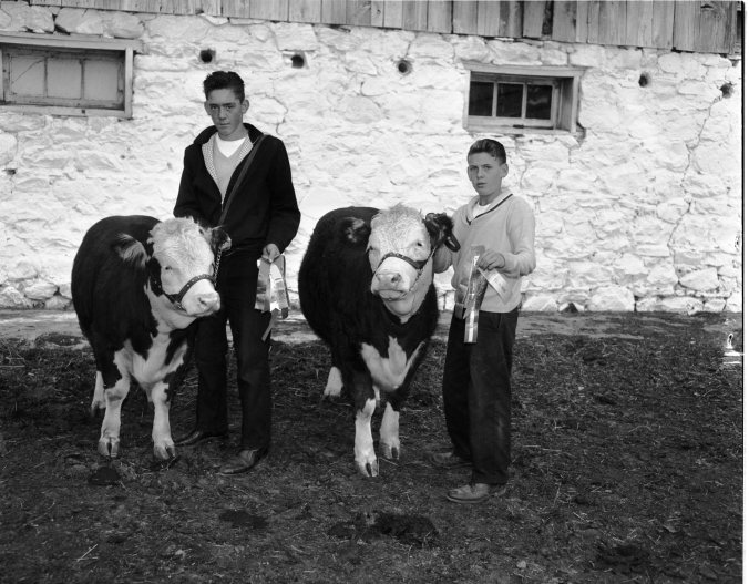 Members of Vasey 4-H Calf Club, these two lads have won more than their share of prize ribbons at fairs in Midland, Coldwater, Barrie and Collingwood in recent weeks. They are Brian, 15, left, and Jimmy, 14, sons of Mr. and Mrs. Lloyd Scott, RR 1, Victoria Harbour. Calves are Lady Esther, with Brian, and Lady Perfection.
