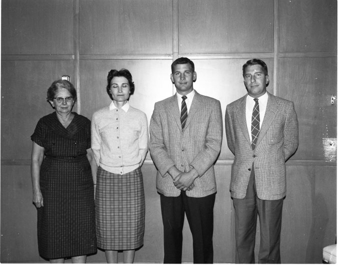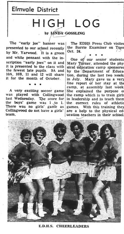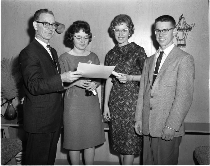 Last Friday was a big night in Elmvale, with the gymnasium of Elmvale District High School the scene of the annual commencement. Pictured above, left to right, are Frank Clute, a native of Elmvale and now a high school inspector, Elaine Lougheed, Sharon Cowan and Bob Eberhardt, who gave the valedictory address. All three earned honour graduation diplomas last year. Mr. Clute had previously taught at Sixth Street School in Midland.
