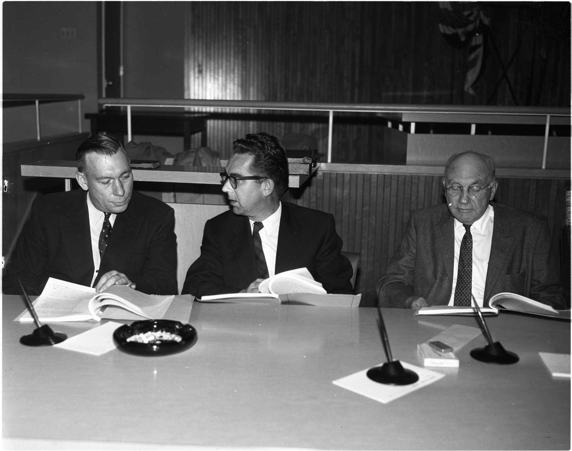 The smile on Planning Board Chairman J. E. Lawlor’s face may well result from the public reaction to the advance showing of the plan last Monday night, this photo, left to right are Gerald Therrien, Ed Lawlor, Kenneth Cowan and Myer Mostyn; Photo 7755 shows three members of the board studying the 83 page text of the official plan. Left to right are, Stuart Glassier, Walter Kluck and Cec Moreton.
