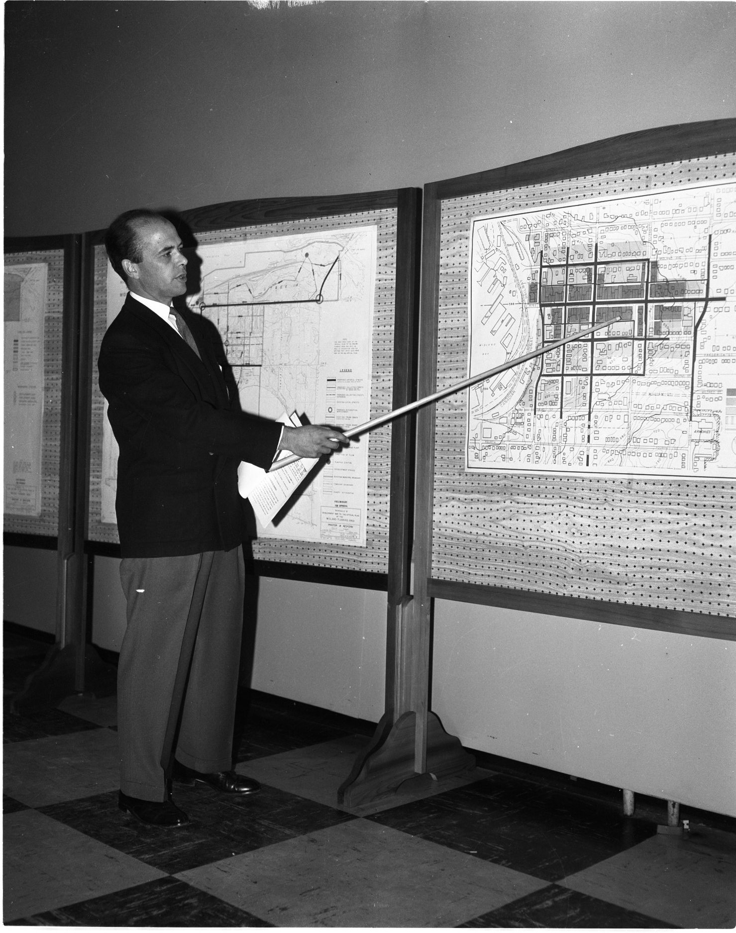 Planning board Chairman J. E. Lawlor is seen here explaining the central business district section of the official plan to a group of 44 interested citizens who attended the advance showing of the plan Monday night.