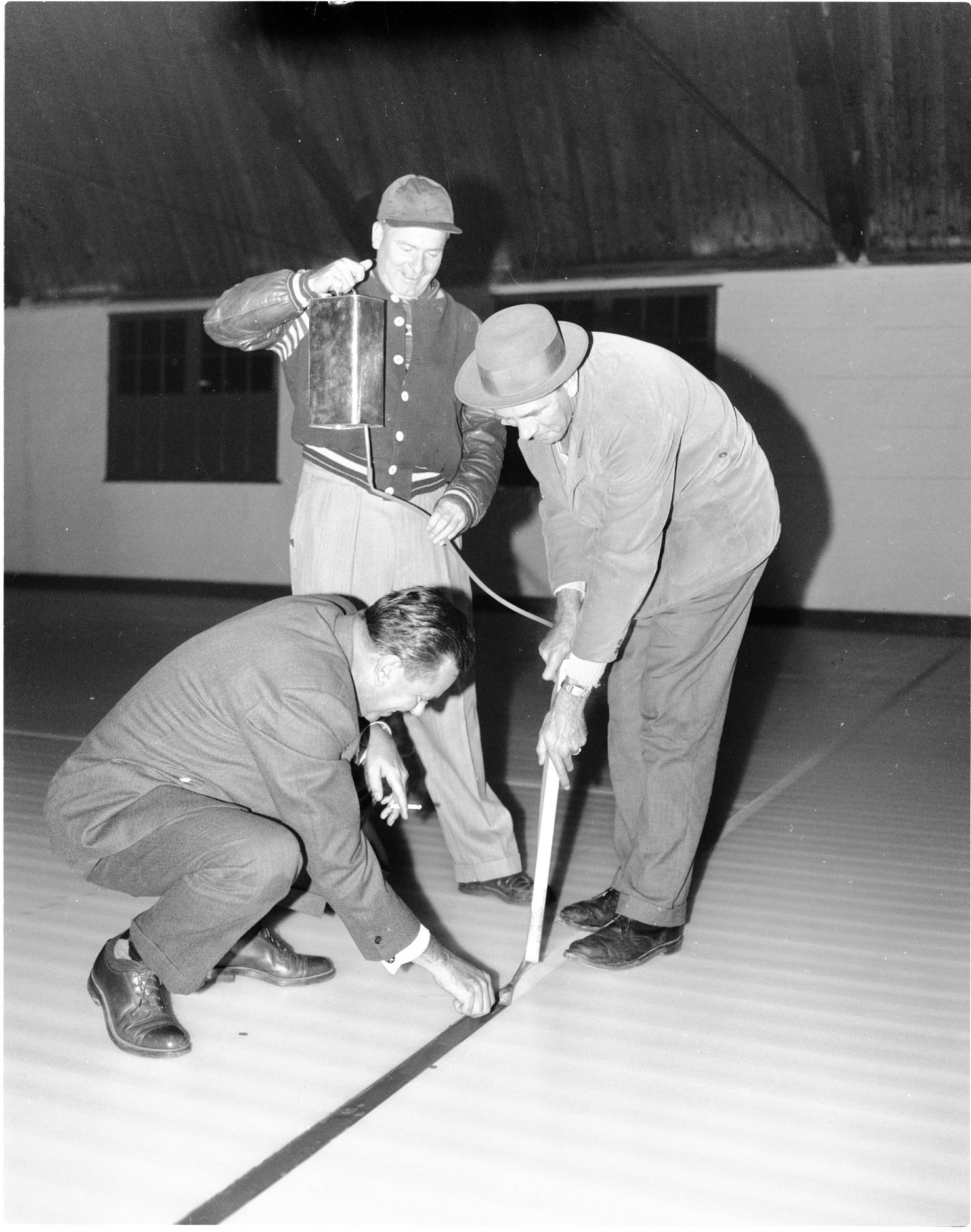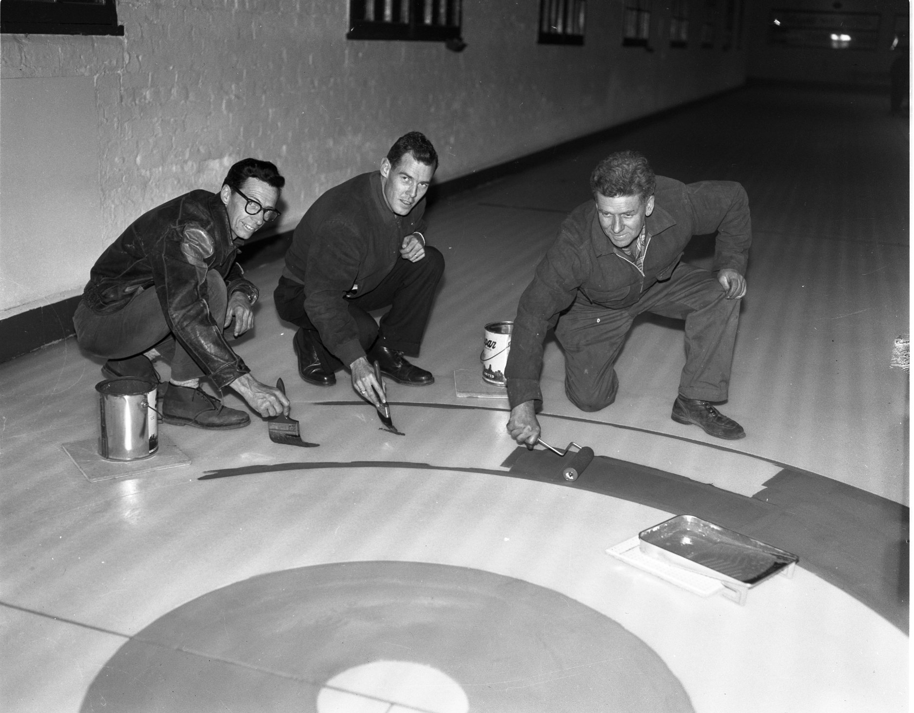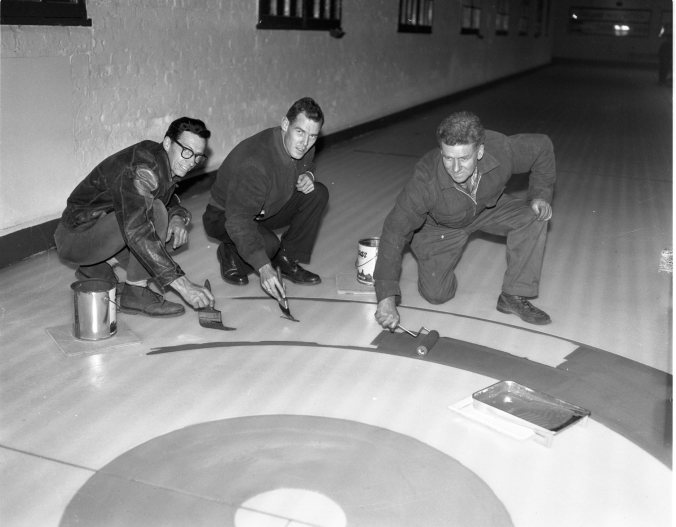 These chaps were cool, but cool man!, as they painted the rings on the ice at Midland Curling Club in preparation for a new season slated to start Monday night. Painting one of the ten big rings above are, left to right Norm Polmateer, Ross Thompson and Jack Wilson.