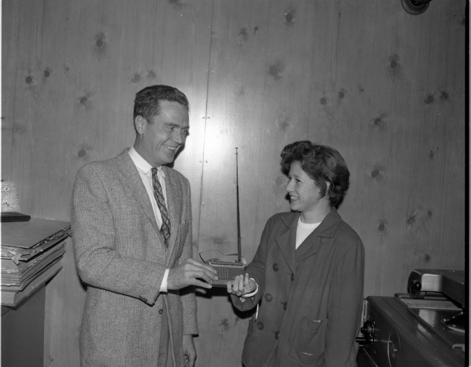 Pictured above is Frank Keenan, manager of the Midland Cross Country Store, presenting the $45.00 transistor radio to the winner Miss Lola Brown of 173 Sixth Street, Midland. Photo used in an advertisement for the store.