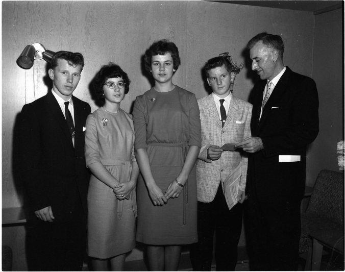 Friday was a big night in Elmvale, with the gymnasium of Elmvale District High School the scene of the annual commencement. Picture shows Wils Harrison (right) presenting Midland Free Press awards to Douglas Eberhardt, Mary Joan Dutcher, Judy Campbell and Douglas Cox.