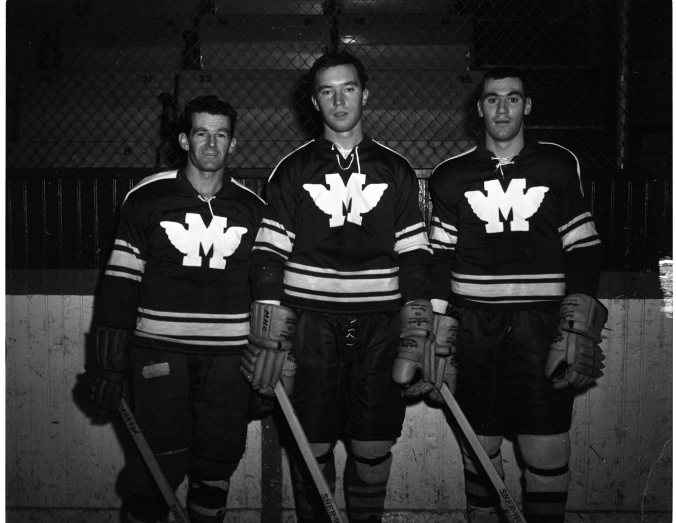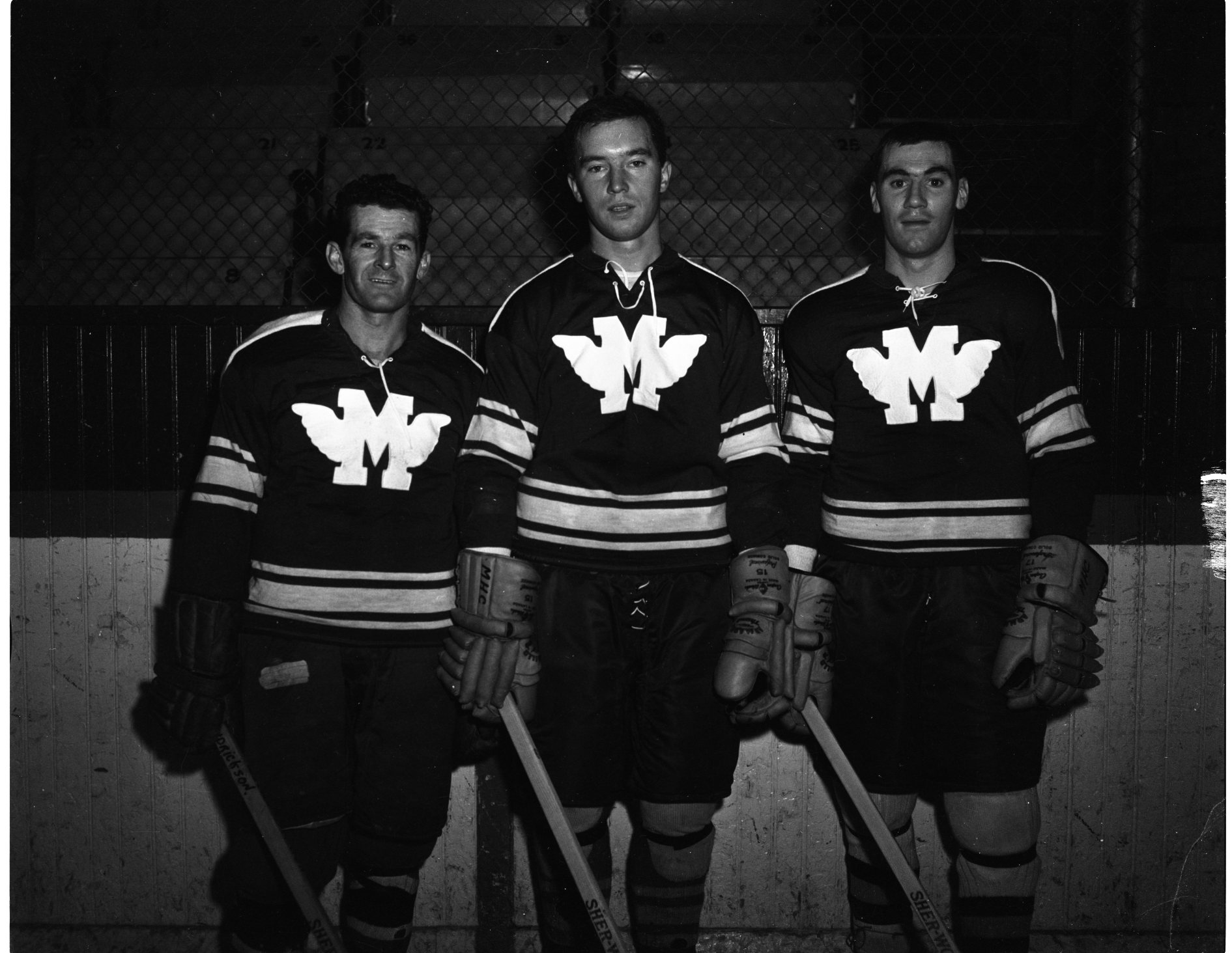 When the new Midland intermediate “A” Flyers take to the ice at Arena Gardens against Orillia Friday night, coach Jim Johnson will be looking for big things from the three seasoned stars above. All from Oshawa, they are, left to right, Lloyd Arnold, Dave Nicholishan and George Westfall. Arnold’s career includes several seasons with British and European teams. Nicholishan was a member of the world champion Whitby Dunlop’s and Westfall has also had wide experience.