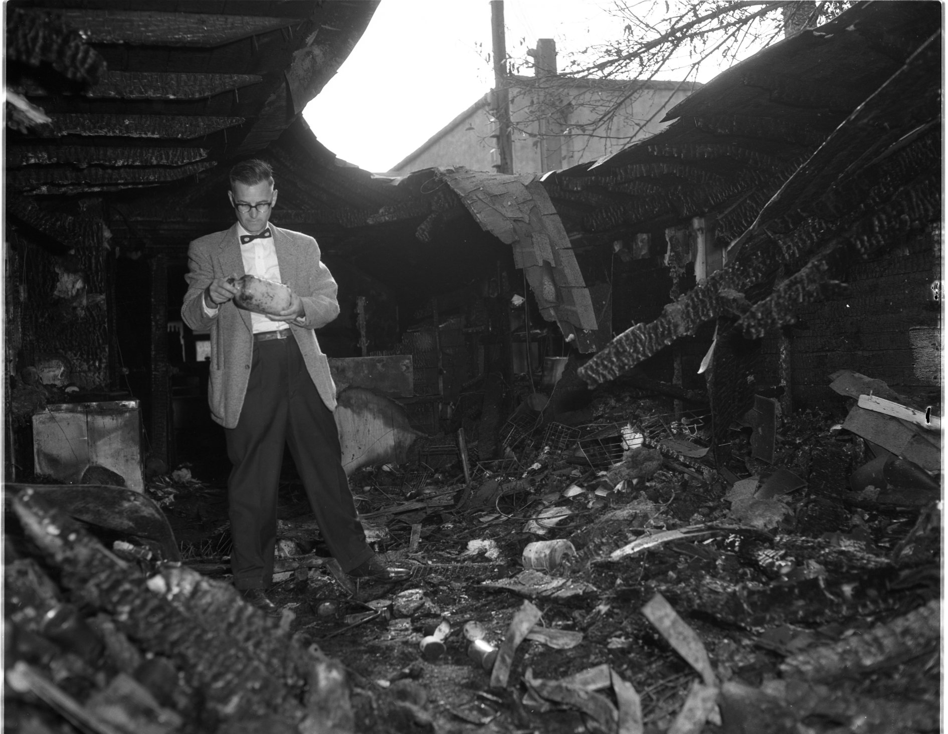 Joy at the opening of his new IGA store in Elmvale last week was somewhat tempered for Fred Griffis when the old store on Queen Street was gutted by fire Thursday night. Mr. Griffis is seen above in the rear of the store, which bore the brunt of the damage.