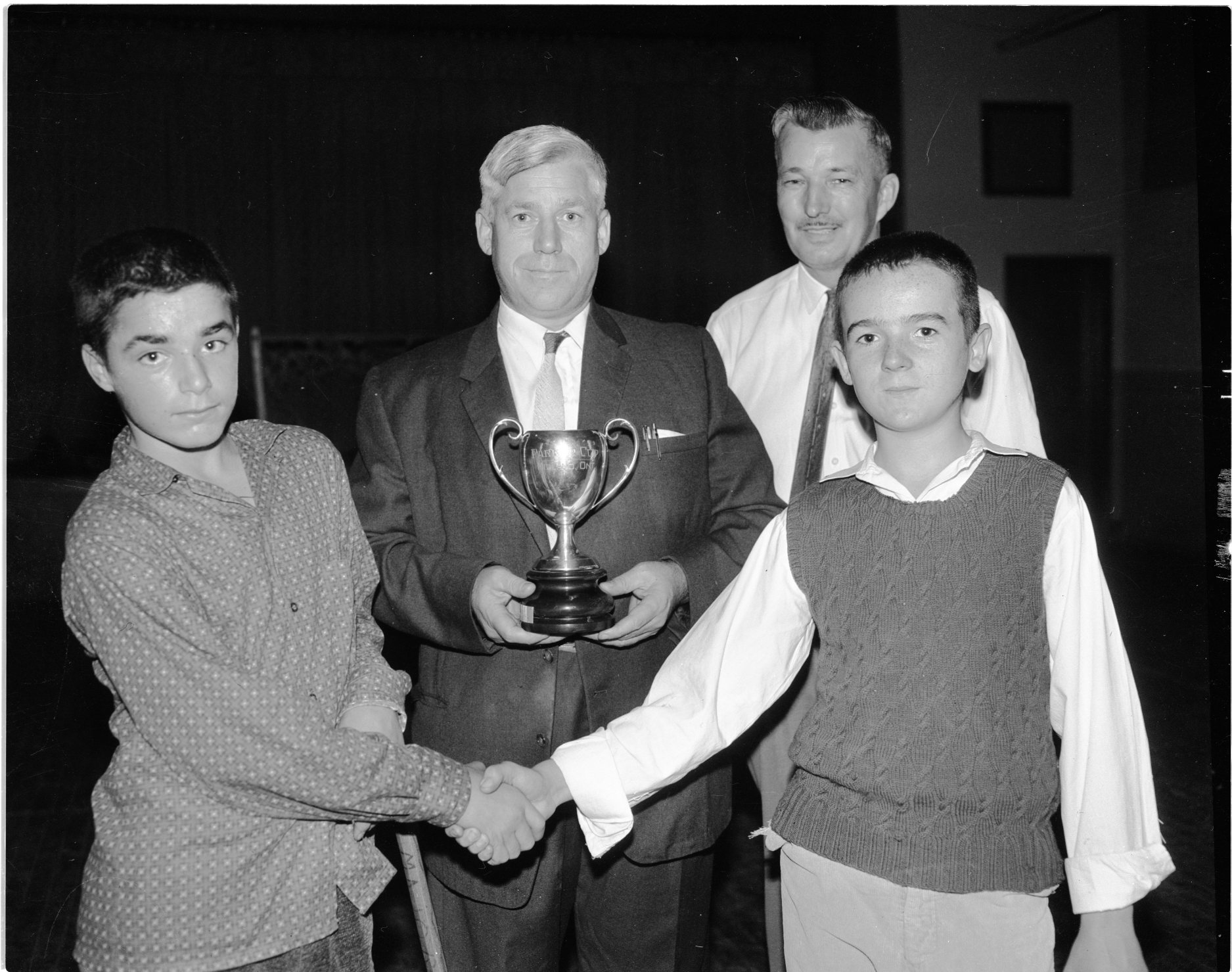 Peewee lacrosse, revived in Midland after a lapse of several years, proved quite a success over the last few weeks. In the final, held in Knox Church auditorium last week, the Iroquois edged the Hurons 9-8 to win the trophy presented by Mayor Charles Parker. Mayor Parker is seen above with winning captain Eric Major (left), Ian Dalrymple, Huron captain, and Rev. Len Self, who promoted the league.