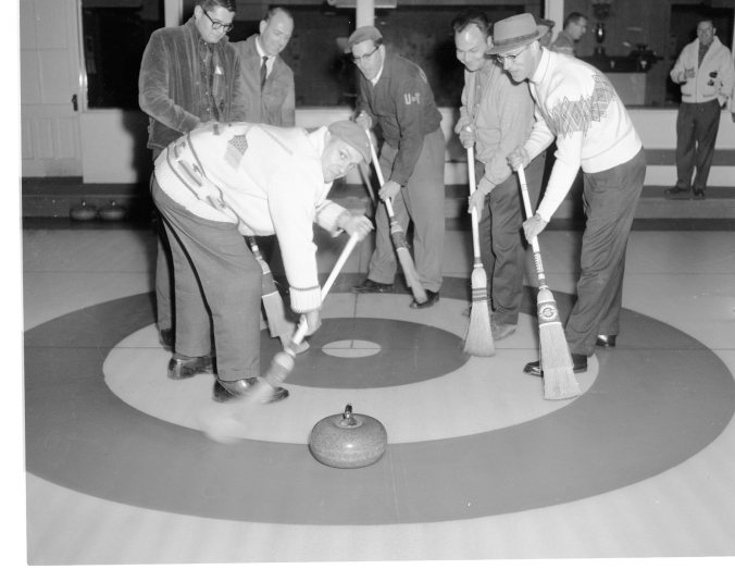 It’s curling time again across the land, in Midland as elsewhere. The men’s section of the Midland club has over 20 new members. Some are seen getting their preliminary instruction in the besom and stane (broom and stone) art. In this picture veteran “Toots” Wallace shows one group the proper way to release a stone while Doug Haig, at left in picture 7842, shows the way to “soop her up” with the broom.