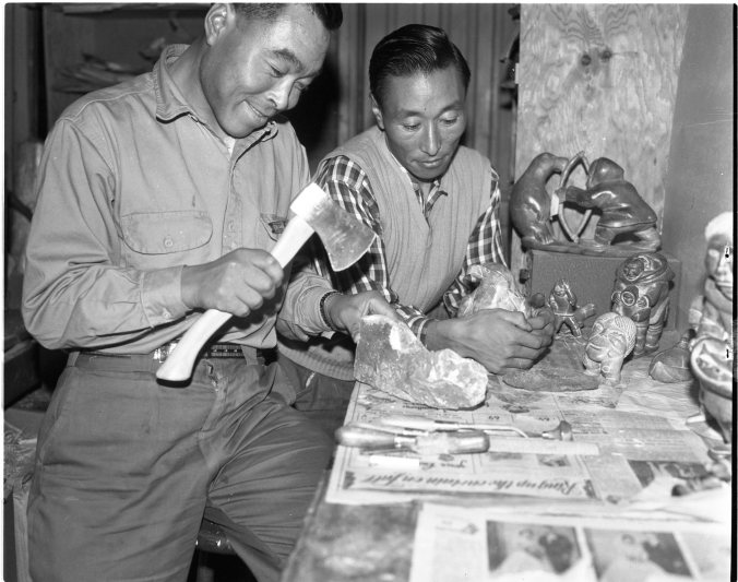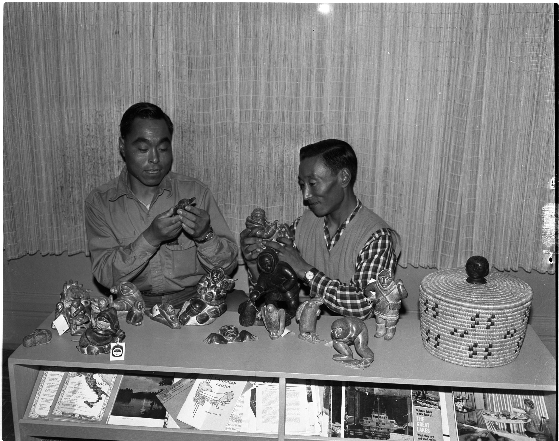 Feature of an “Arctic evening” to be held in St Mark’s Church parish house Wednesday night will be a display of Eskimo carving and graphic arts by Innukpak (left) and Pauloosie. The two 31-year-old Eskimos are staying with Mr. and Mrs. Gordon Yearsley, Third Street. The carvings and drawings done by the two men, and those collected by Mr. Yearsley, can best be described as “terrific”.