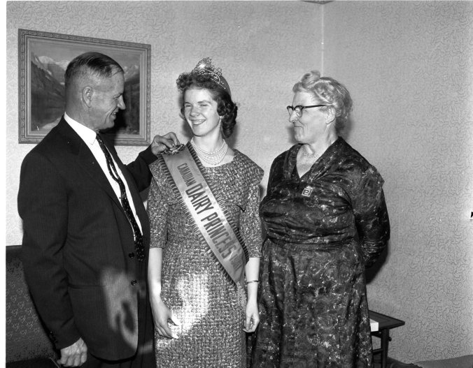 Banner which proclaims Clara Taylor, 20, of Saanichton, B.C., as Canada’s “Dairy Princess” for 1961 is admired by Mr. and Mrs. Harvey Etherington of Victoria Harbour. Appearing at the Royal Winter Fair last week, Miss Taylor stopped off to visit her Victoria Harbour cousins on the way home.