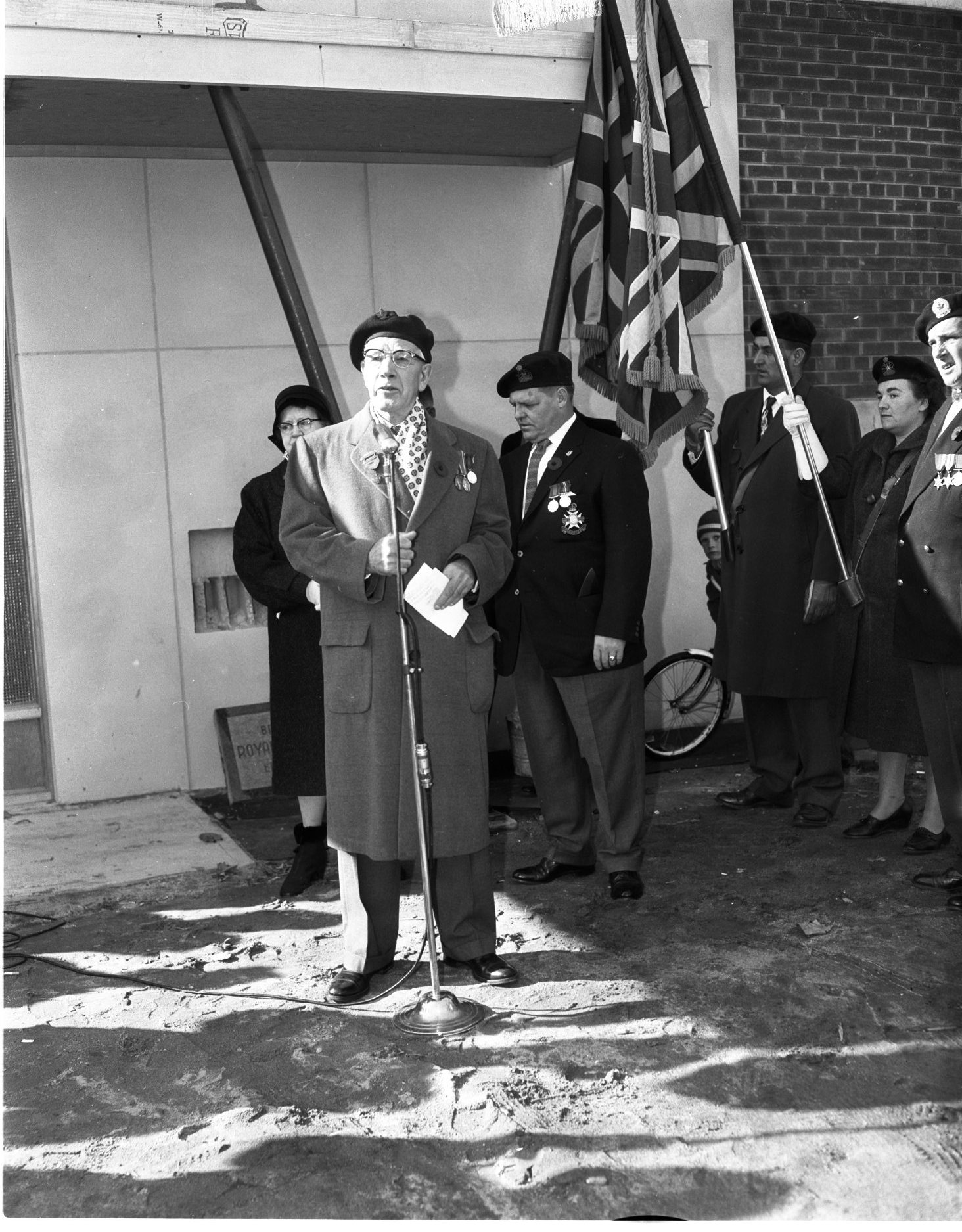 Oldest living past president Branch 80, Royal Canadian Legion, Midland, Donald Swinson is seen addressing the large crowd that attended the laying of the cornerstone of the new Legion Hall Saturday.