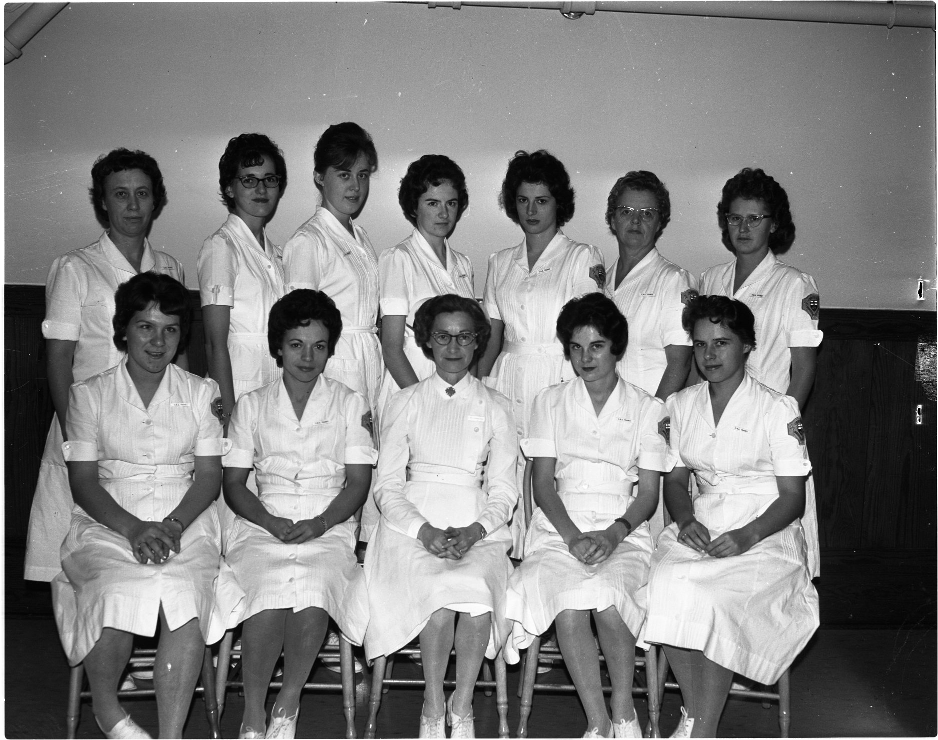 Second nurses aid course to be operated at St. Andrews Hospital, Midland, is now well, underway with 11 students on hand. Seen above, left to right are: front row—Carol McGee, Port Colborne; Mrs. Shirley Widdes, Midland; Mrs. W. Bramah, instructress; Louise Ballantyne, Egbert; Mieke VanderKnapp, Collingwood; back row—Leola McMillan, Owen Sound; Ann Raspberry, Smooth Rock Falls; Carole Wylie, Collingwood; Shirley McDonald, Alliston; Barbara Dion, Midland; Mrs. Pearl Cowden, Midland; Jean Emms, Barrie.
