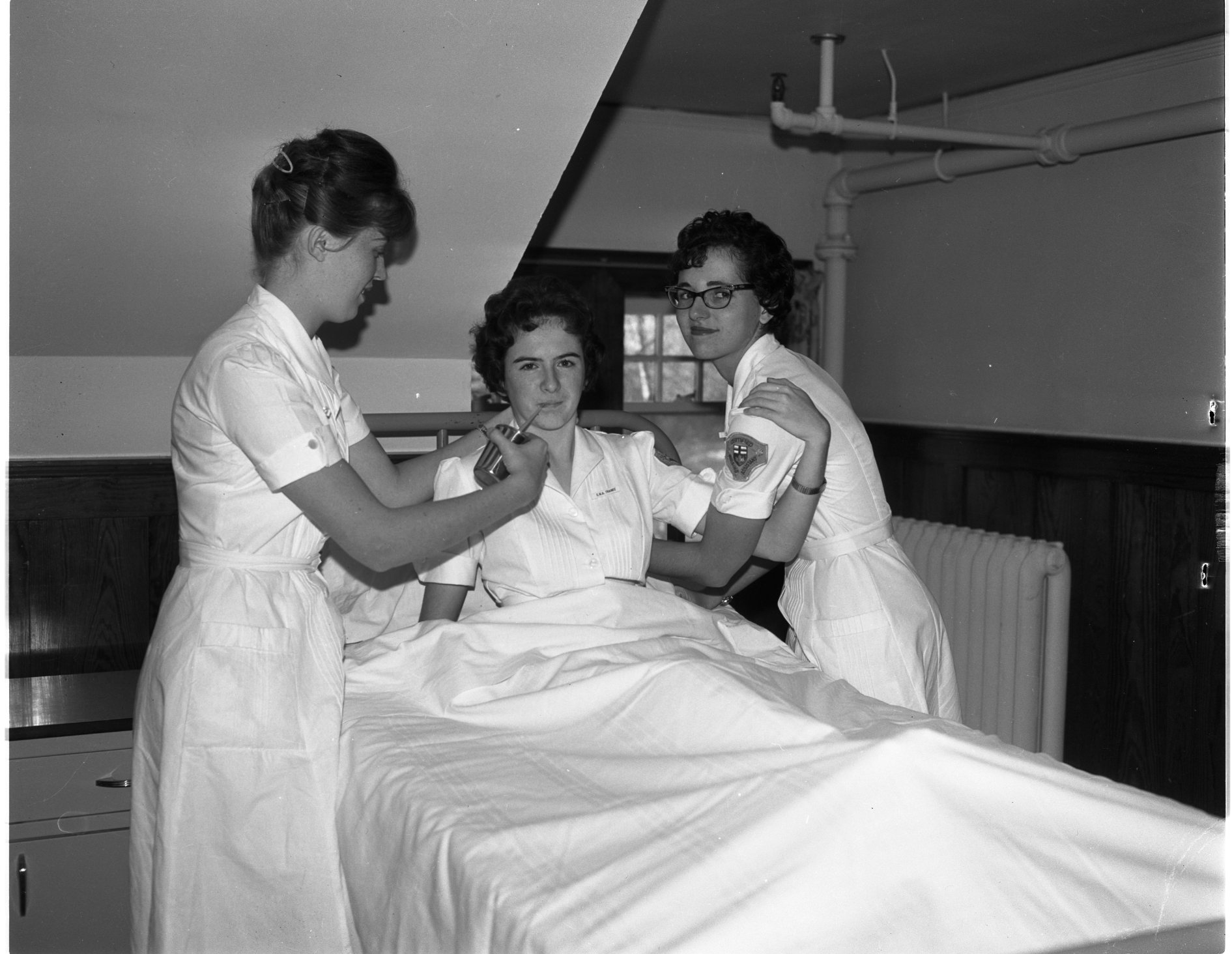Learning how to look after a bed patient is part of the nurses’ aide course being held at St. Andrews Hospital, Midland. In this practice run, Shirley McDonald, Alliston, serves as “the patient” for Carol Wylie (left), Collingwood, and Ann Raspberry, Smooth Rock Falls.