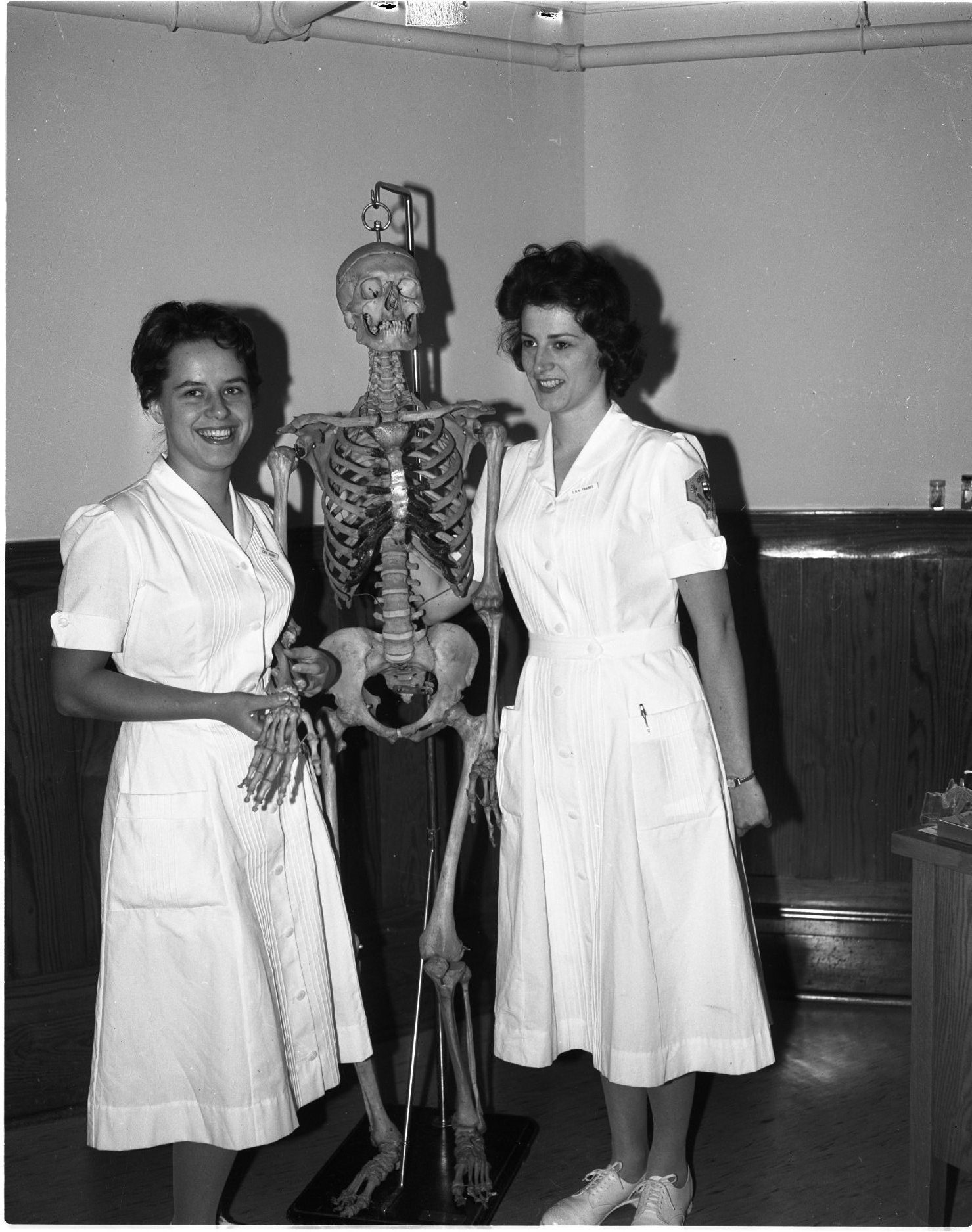 These two pretty, young students attending the certified nurses’ aide course at St. Andrews Hospital have a new boy friend, “Mr. Bones”. They are Mieke VanderKnapp, Collingwood, and Barbara Dion, Midland.