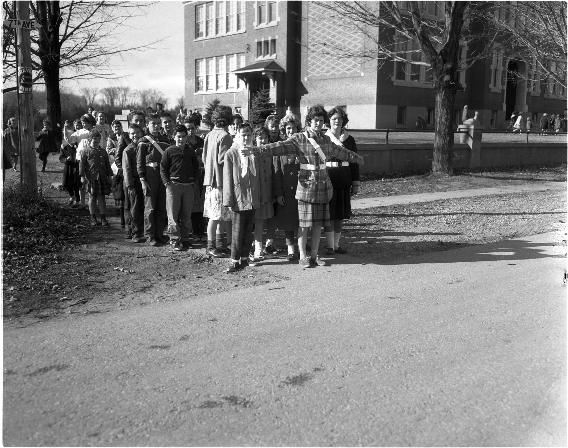 Sponsored by the public school board, Port McNicoll now has a school patrol to assist pupils across four main crossings near the school on Seventh Avenue. Above, Elaine Beausoleil is seen with a group of youngsters waiting to cross the street in front or the school.