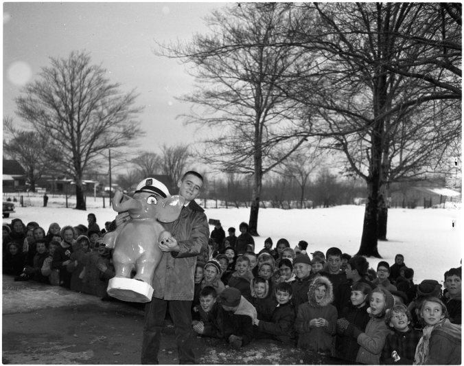 Pupils of Regent School had their turn to cheer this week when they won Elmer, the safety elephant, for the next three months. Sgt. Ernest Bates is presenting Elmer to Ian Dalrymple, while Principal M. O. Lewis stands by. Ian gives his classmates a closer look amidst deafening cheers.