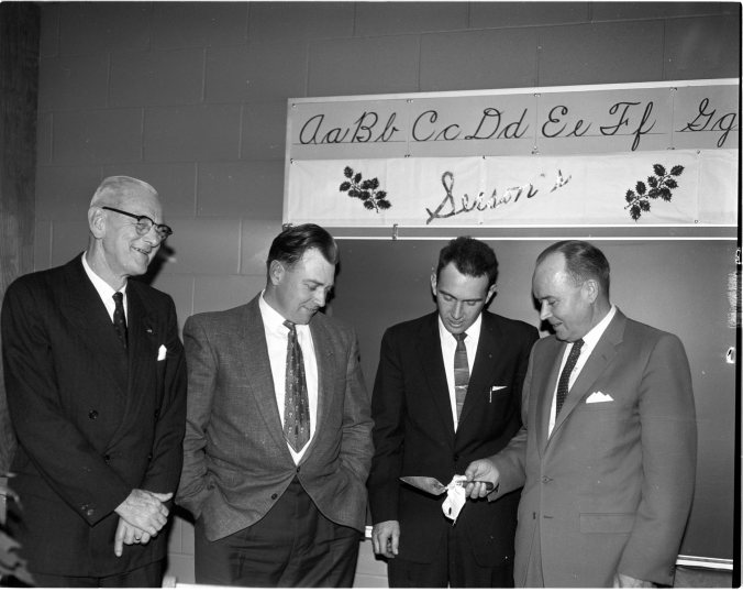 Members of the school board of SS 2 Baxter, are seen above with W. F. Hammell, Muskoka public schools inspector, at the official opening of the new Honey Harbour school last week. Left to right are Ivan Schlegel, Tom Hewitt, chairman J. Ross Birch and Mr. Hammell.