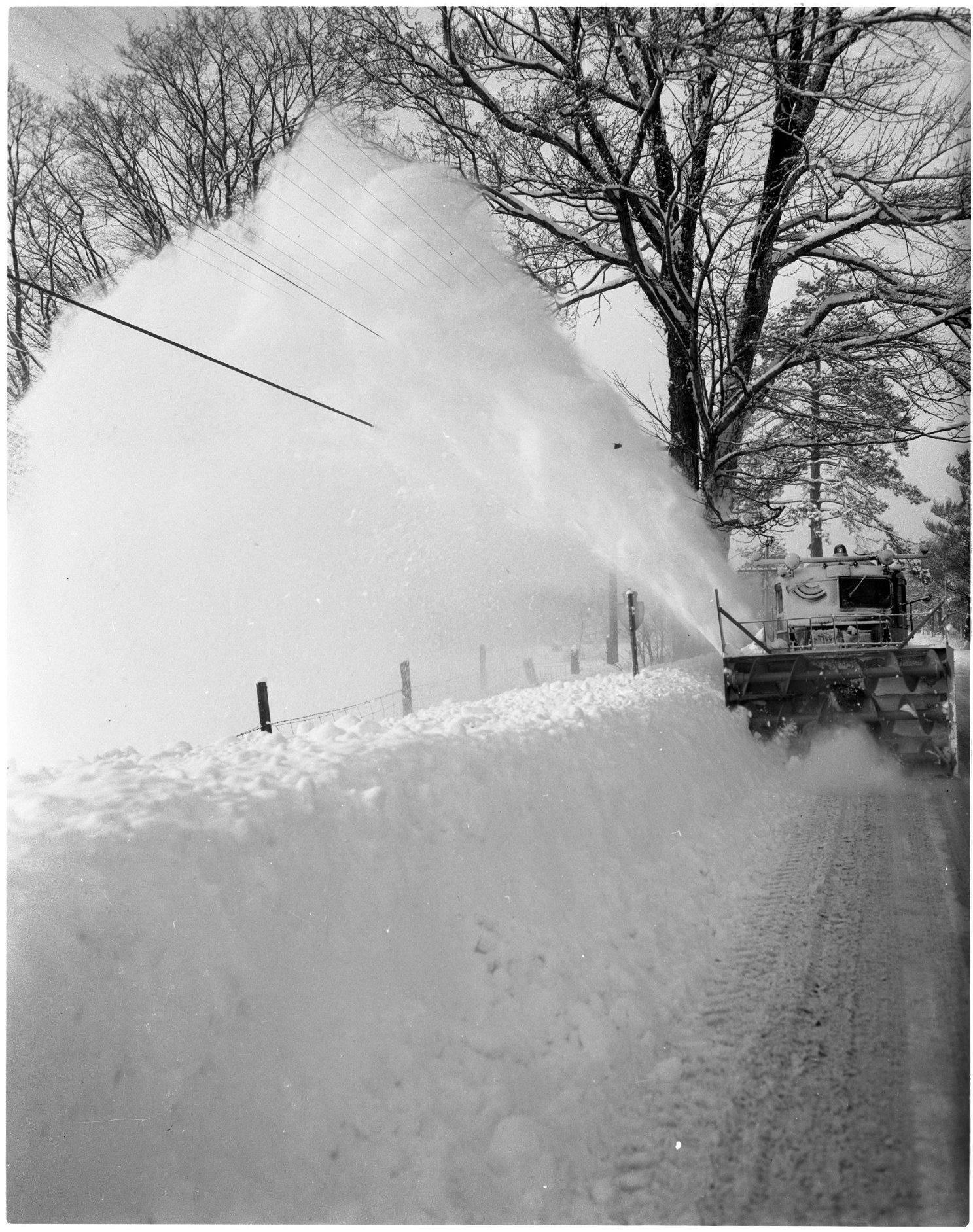 Snow-blowers made their first appearance of the season in the Midland area last week following the severe storm of Monday night and Tuesday morning. This machine is throwing snow 40 feet into the air as it widens Highway 27 between Hugel Ave. and Yonge Street.
