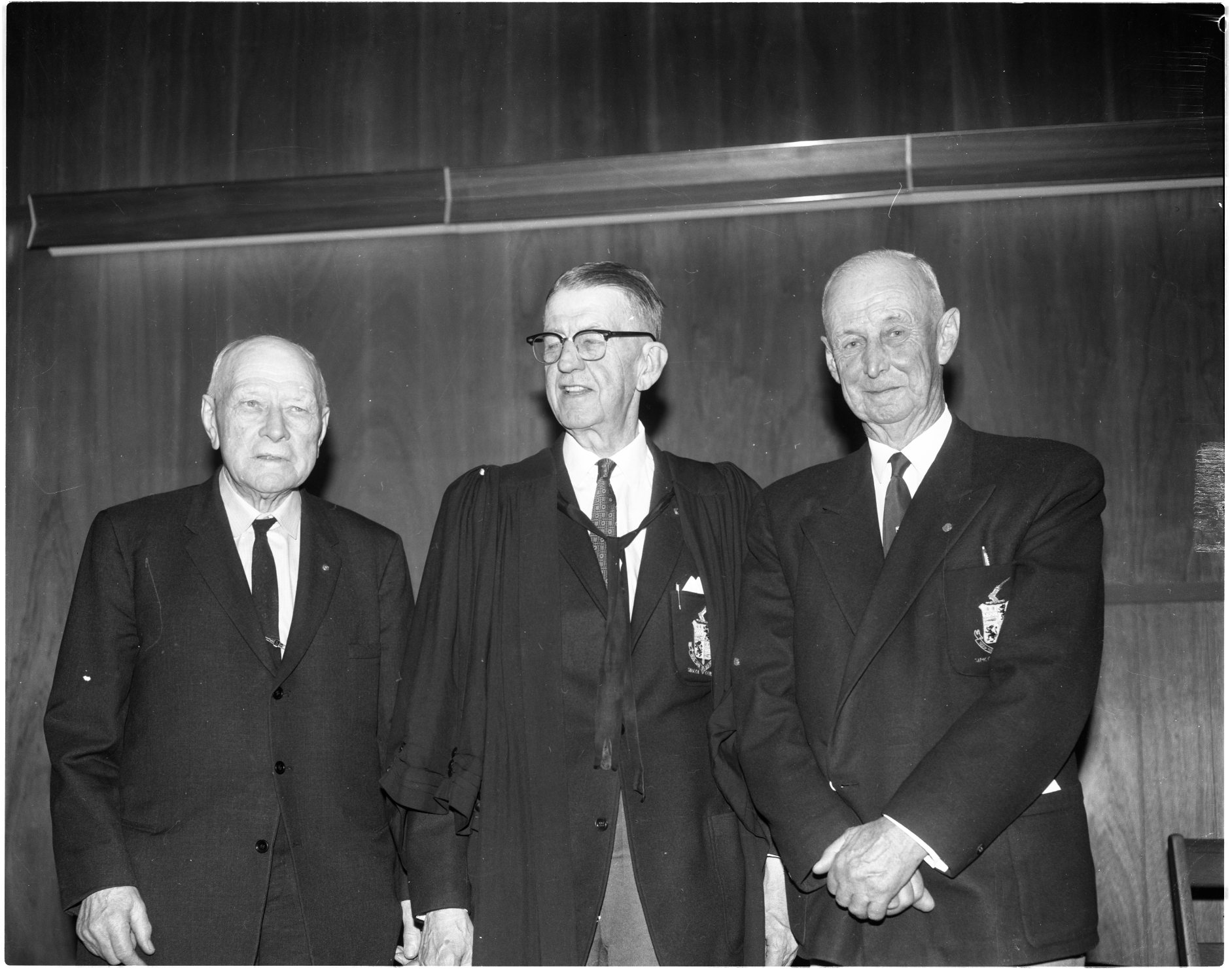 The old and the new in wardens in Simcoe County are seen in this picture. Reeve John McDonald of Orillia, the new, is seen between Tom Simpson, left, who was warden back in 1913 when he was reeve of Tiny, and Charles Eplett, warden in 1923 when he was reeve of Coldwater.