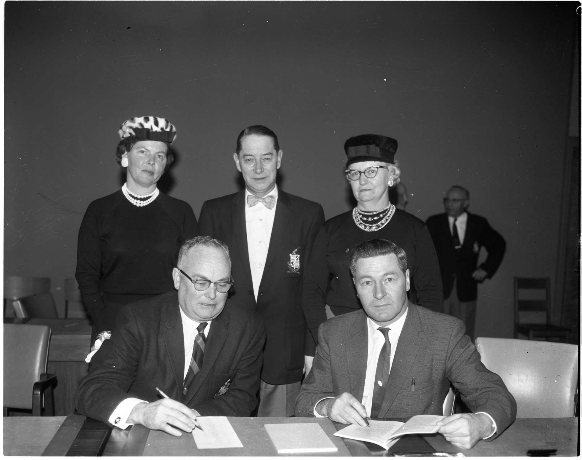 Trying out their new desks in Simcoe County council chambers at the start of the January session Monday are Midland’s Deputy-Reeve William Orr (left) and Reeve W. A. Argue. At rear are Mrs. Orr, Reeve Ernest Cadeau, Victoria Harbour, and Mrs. Cadeau.