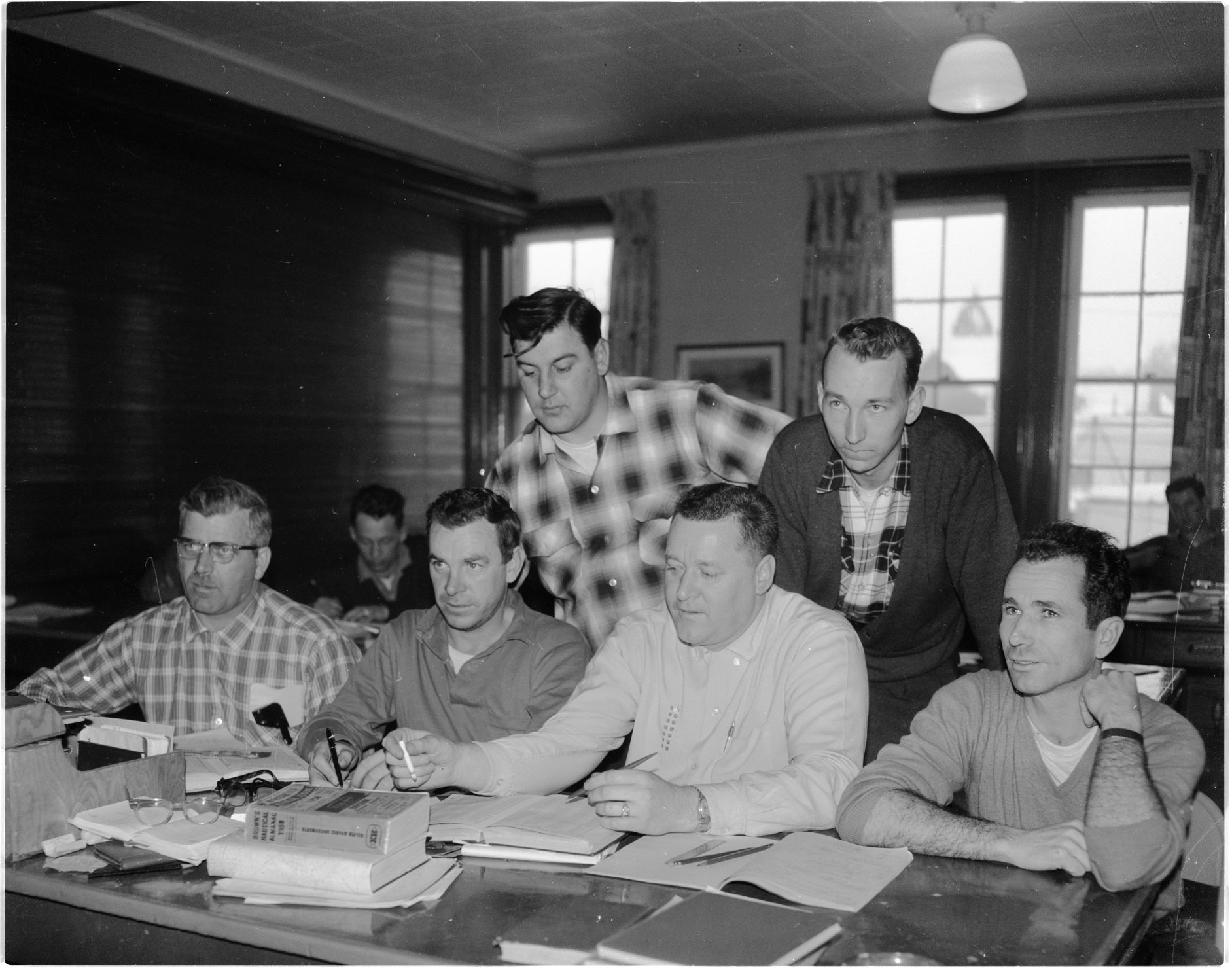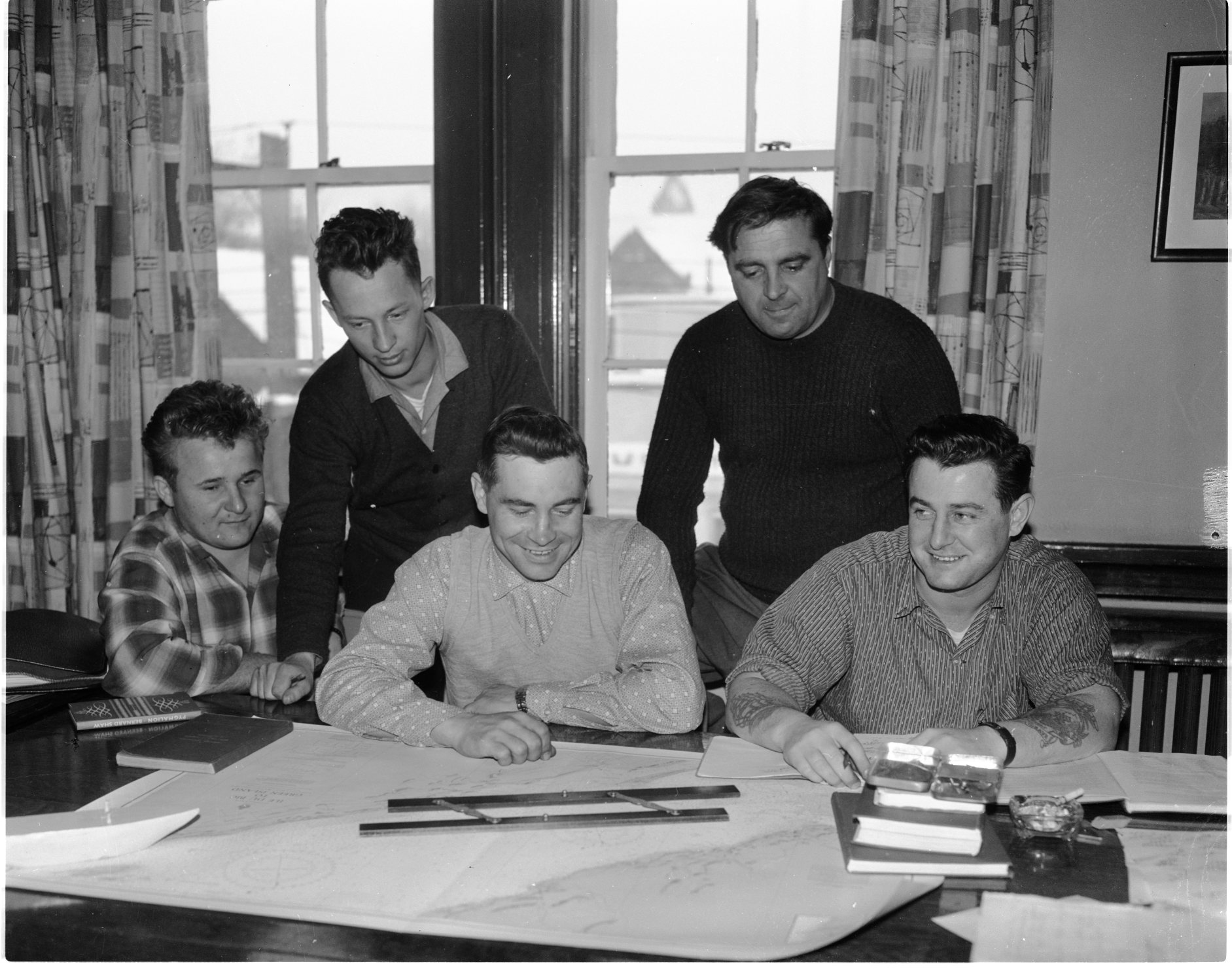 Their boats ice-bound, many sailors are taking advantage of the navigation classes held at Midland YMCA under sponsorship of MPDHS. In the top picture, left to right, are Eddie Sipala, Midland, Gary Richmond, Nobel, Lorne Rowe, North Bay, instructor William Esty, Penetang, and Art Cadeau, Midland. Boning up on logarithms in the bottom picture are (seated) Conrad Vaillancourt, Midland, Robert Blanchard and Bill Thoms, Waubaushene, George Potter, Midland, and standing, Cornelius Cadeau, Penetang, and Bob Tremblay, Midland.