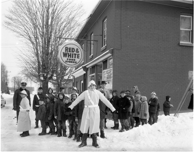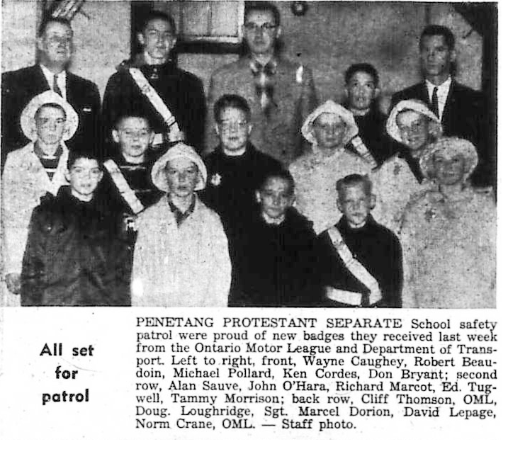 School crossing patrols were put into force in Midland Friday for the first time at a number of dangerous intersections. In the top picture, Sgt. Ernest Bates adjusts belt on one young guard while the others are all set for action. In the bottom picture, Bill Jory holds up a line of youngsters until the way is clear at Yonge and Russell Streets. Uniforms were provided by the Ontario Motor League. Kettle’s store.