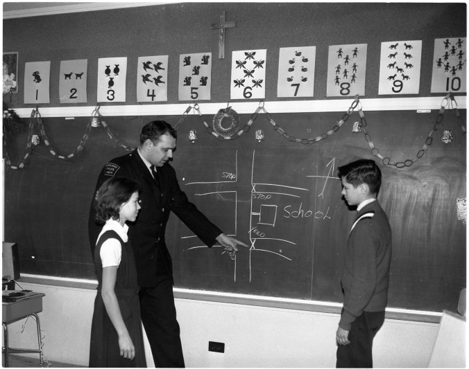 Listening attentively to Sgt. Ernie Bates as he shows the proper way to control traffic at the Sixth Street and Dominion Ave., school crossing are Paulette and Lorne Antaya, captains of the St. Mary’s School Patrol. Supervision at dangerous intersections in the town started last Friday and is working out quite satisfactorily school officials stated.