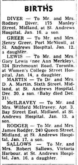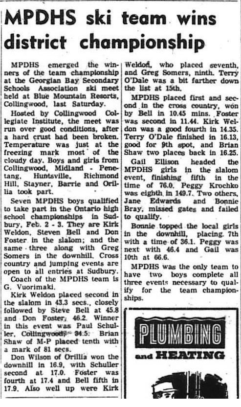 Winter time is still a wonderful time for Canadian youngsters, despite what their disgruntled elders might say about the subject. Having a “whale of a time” in the snow at Midland Ski Club are, top to bottom, Nancy, Sharon and Wendy Biggar, energetic daughters of Mr. and Mrs. Don Simpson, Midland. [This photo was actually from February 3, 1960 and was used again here on the 19th. We also used it in the 1960 version of this blog, so yes, you have seen it before.]