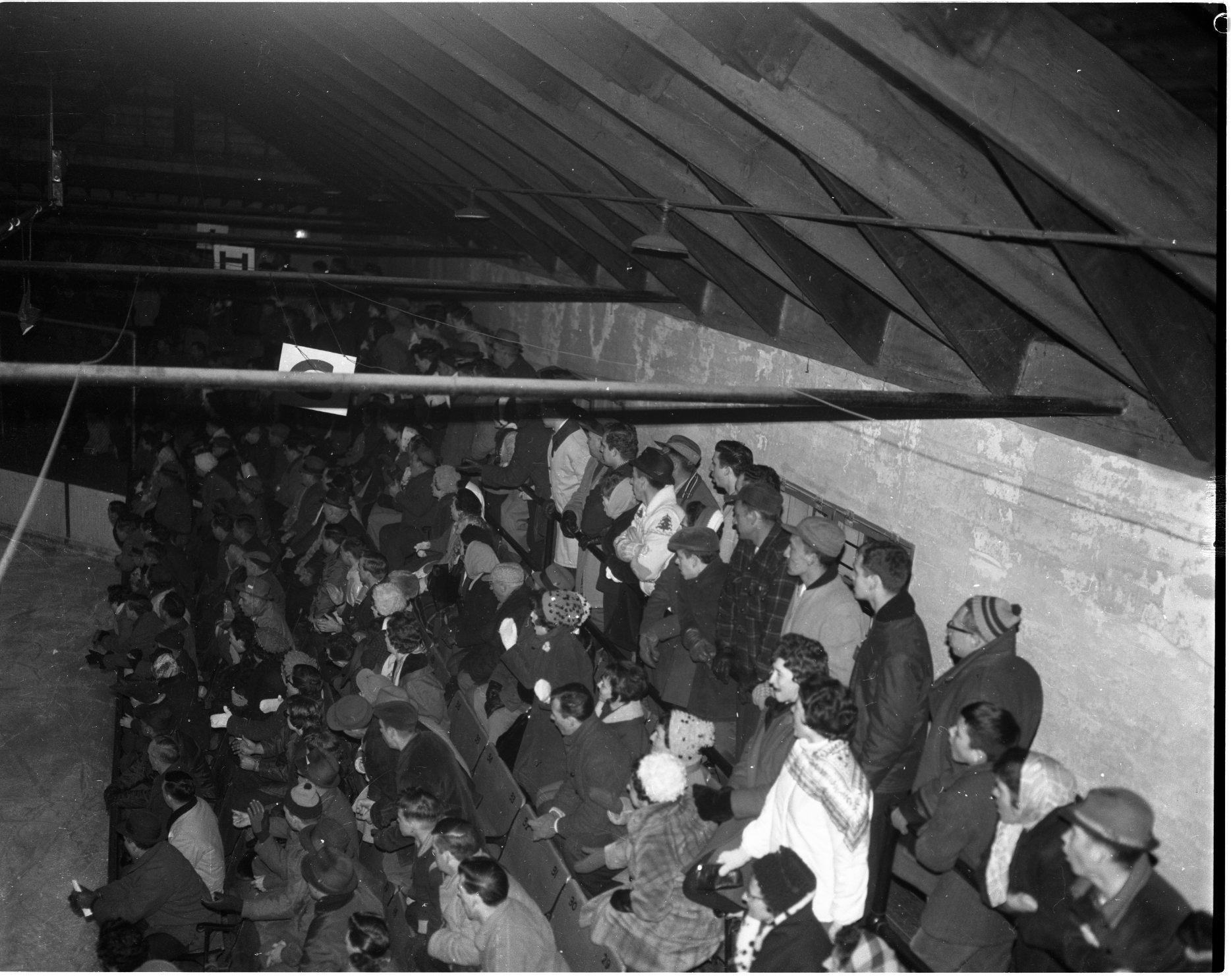 The more than 1,500 fans at the Midland-Collingwood game Wednesday night were on their feet most of the night cheering the torrid action, by both teams. A portion of the crowd is seen above as Flyers bombarded veteran Harry Lumley in the first period. Flyers won 6-4.