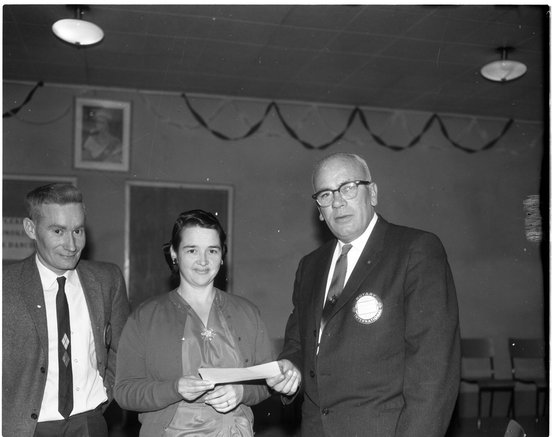 Mrs. Jack Banks, president of the Huronia Retarded Children’s Association, receives $100 cheque from Rotary members, Jim Henry, left, and Lorne Garrow.