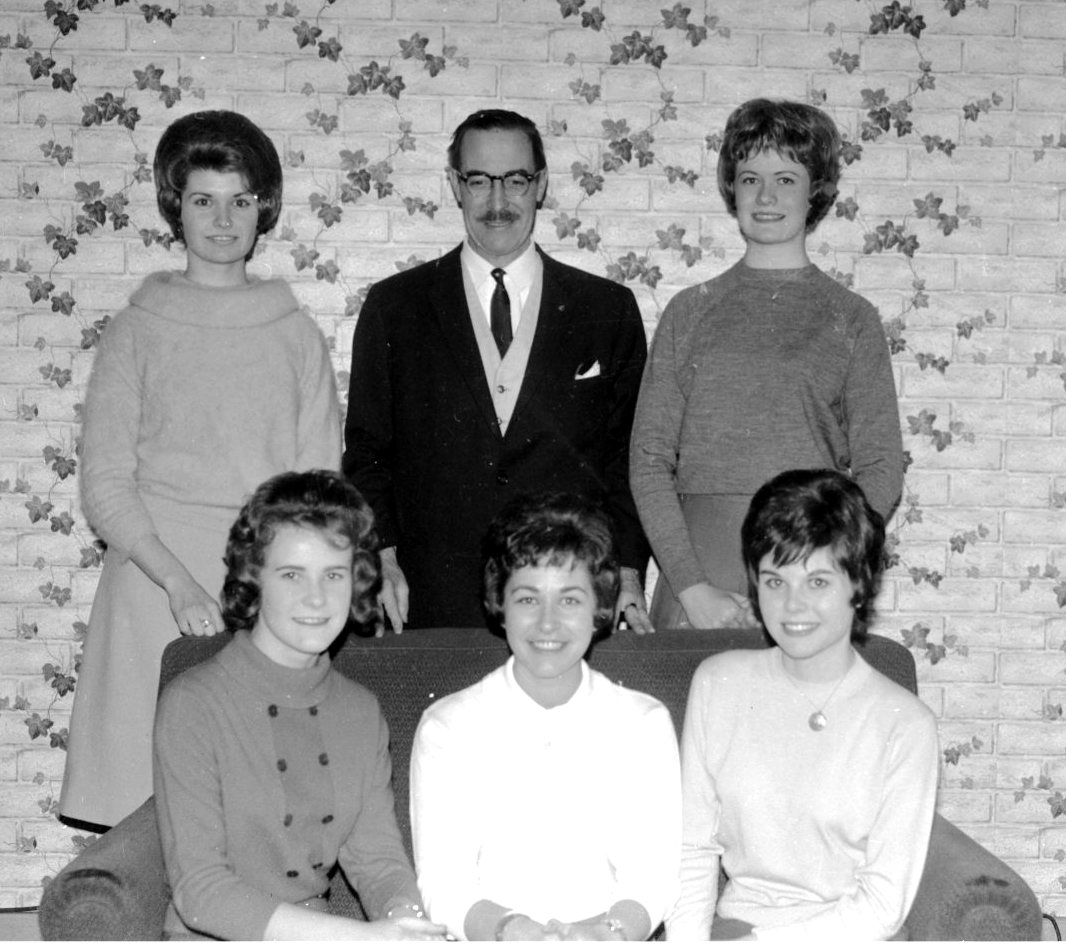 The five finalists in the Queen of Hearts contest are pictured here with Roxy theatre manager Wilf LaRose. The queen who will be chosen tomorrow night at the theatre, will receive many prizes from Midland merchants. Finalists are front row Pat Bate, Margaret Spicer and Bonnie Rourke. Standing beside Mr. LaRose are Sharon Dubeau at left and Betty Trace.