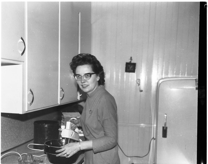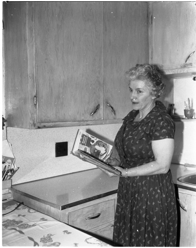 Mrs. John Mackie is busy whipping up something new after winning one of nine five dollar fourth prizes in the cook-book contest sponsored by this newspaper. Mrs. Mackie was awarded a prize for her recipe “Spicy Apple Twists”, which appears on this page. More than 100 recipes were submitted.