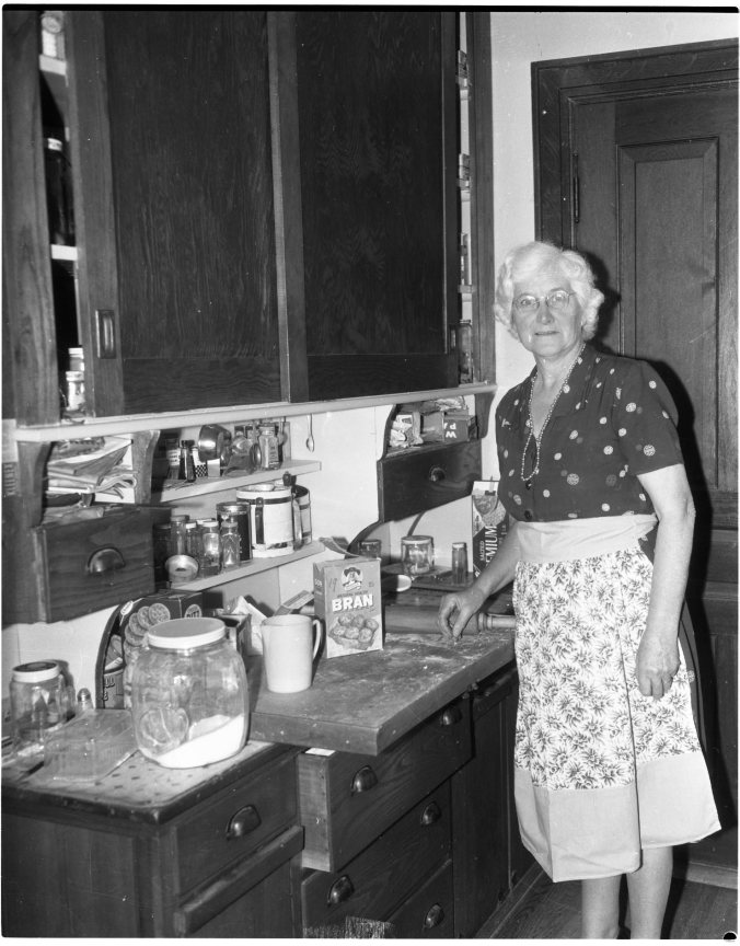 Busy in her kitchen is Mrs. H. E. Miller, 285 Fourth Street, who won a fourth prize in the cook-book recipe contest. “Refrigerator Pineapple Cheese Cake” was the tasty bit that won her the award.
