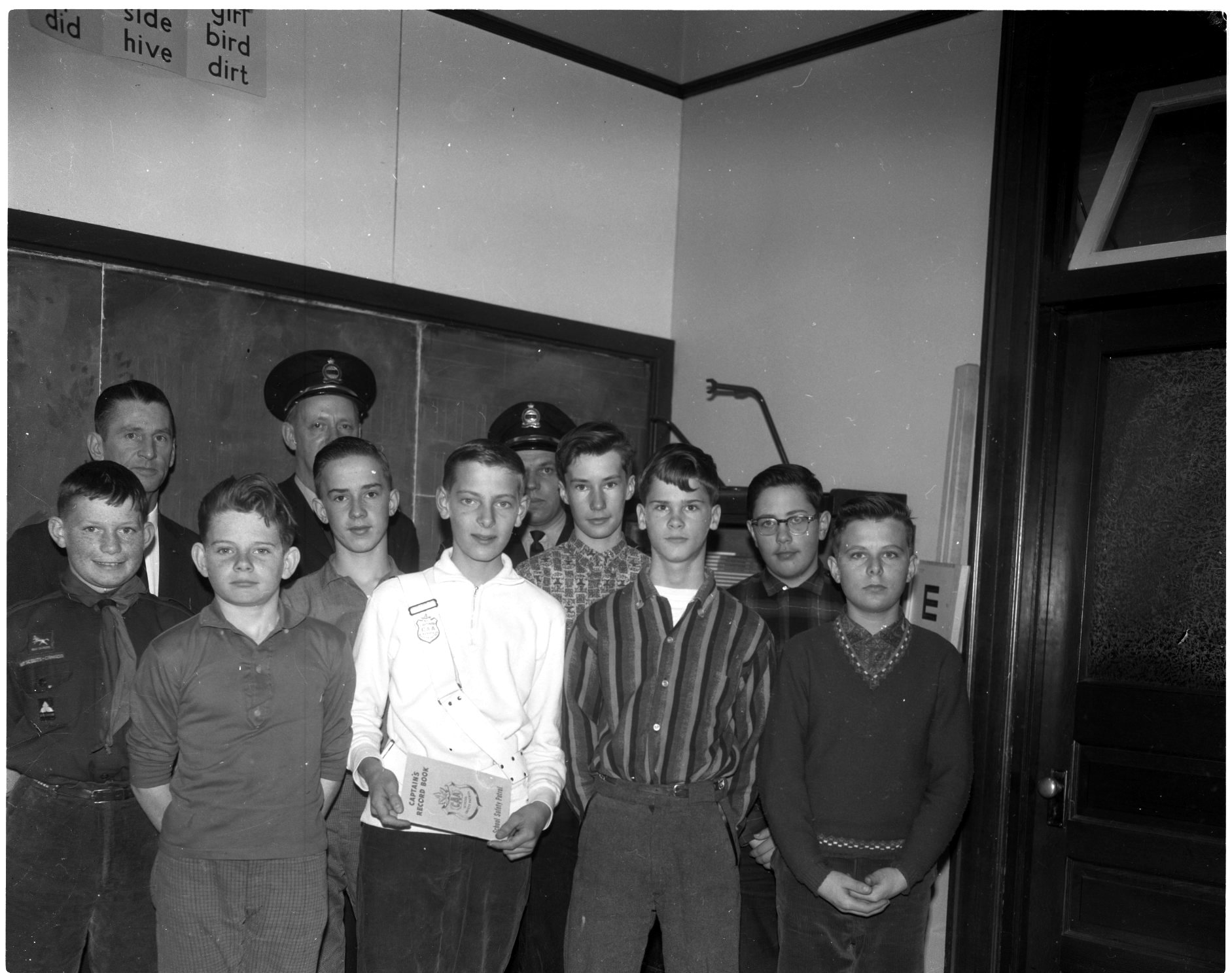 In operation just over a month, Midland’s new school crossing patrol system is working out satisfactorily. Members of the Parkview School patrol, with newly-elected captain John Wilcox are seen above. Girls are, left to right, Judy Fitzgerald, Betty MacKay, Glenda Stewart, John Wilcox, Sharon Park, Ann Webster. Boys in photo 8137 are Ron Henderson, Gary McCaughen, Brian Morden, John Wilcox, Kennedy Self, Leonard Johnston, Stewart McElroy, Bob Powell. In back of both pictures are Norman Crane, Ontario Motor League representative, Chief George Wainman and Sgt. Ernest Bates.