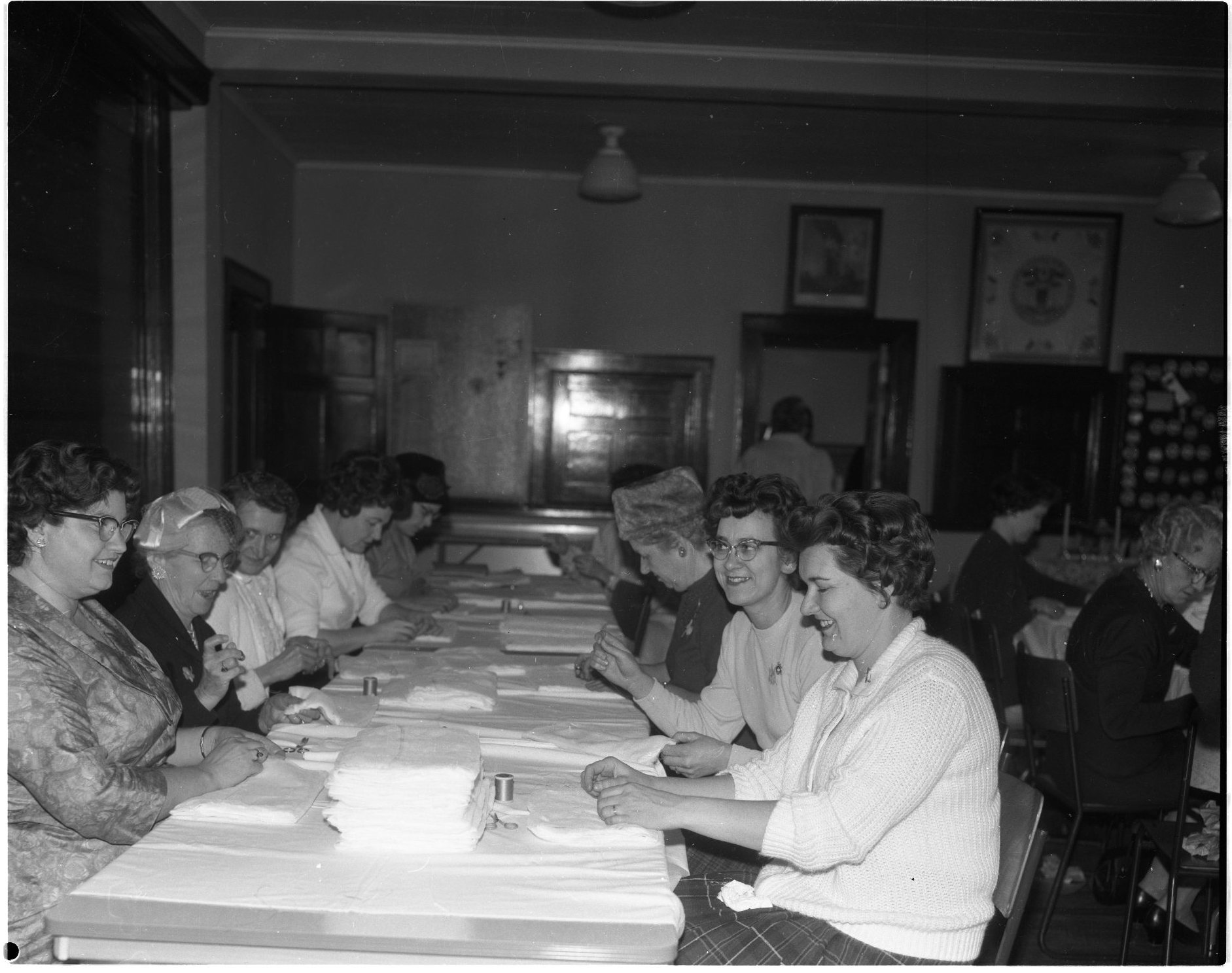 Many hands made lighter work for the Midland branch of the Canadian Cancer Society when they staged a “dressing blitz” at Midland YMCA Friday. Packing the dressings in the top picture are, left to right, Mrs. Alex Campbell, Mrs. Dave Hutchison, Miss Margaret Johnston and Mrs. Alex Craig. Another group of ladies is seen assembling the bandages in the lower photo.