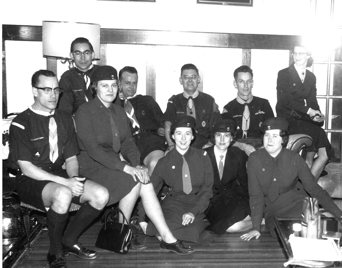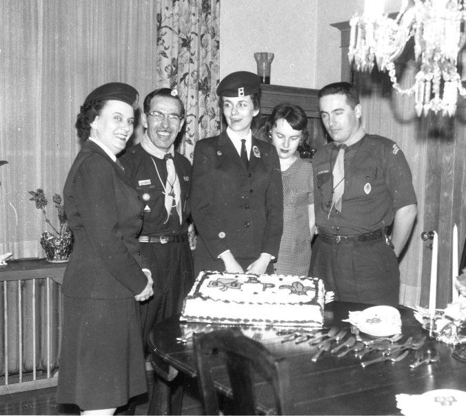 The Guide “trefoil” and the Scout “fleur-de-lis” decorate the cake shared by the leaders and officials of both movements, to mark the birthday of the founders, Lord and Lady Baden Powell. Photo shows some of the guiders and scouters from Wendake district enjoying the party at Mrs. Lawlor’s home Monday night. Left to right in lower photo, Area Commissioner Mrs. Ed Lawlor, District Commissioner Harvey Boyd, District Commissioners, Mrs. Jim Lemieux (Gail) and Mrs. Paul Quilty, and District Cubmaster Art Richards.