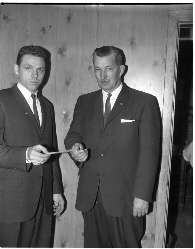 Among the many Midland organizations which have given financial help to Little League Hockey this year is the Junior Chamber of Commerce. Above, Jaycee vice-chairman Bob Bates presents a cheque for $30 to league director Rev. Len Self.