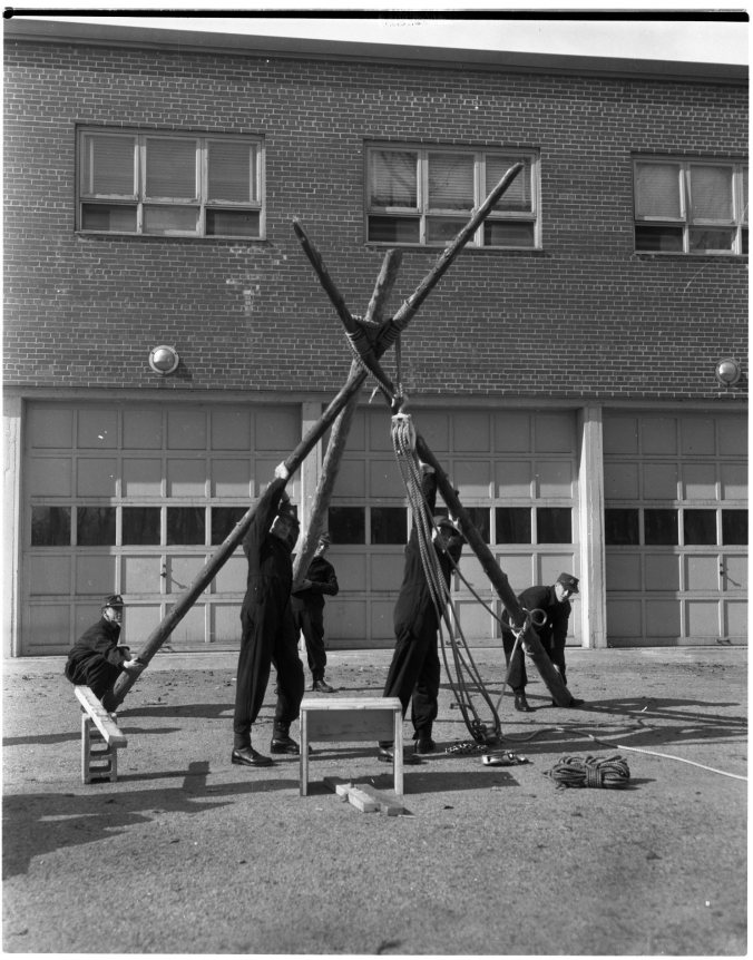Anxious moment comes when recruits raise their carefully constructed “A” pole, used for lifting and lugging heavy objects. This one withstood all the tests. The six week survival course is being held at the Midland Armoury as part of a plan to train 100,000 men across Canada in the art of survival in case of nuclear attack or other emergency. A second course is slated to start April 16 and those wishing to attend are asked to register now at the armoury.